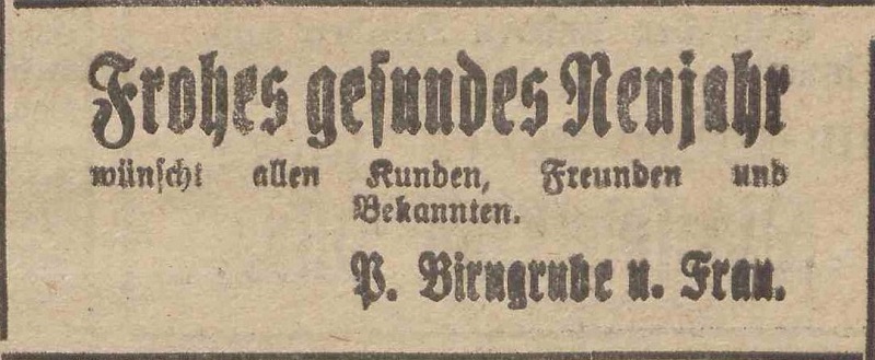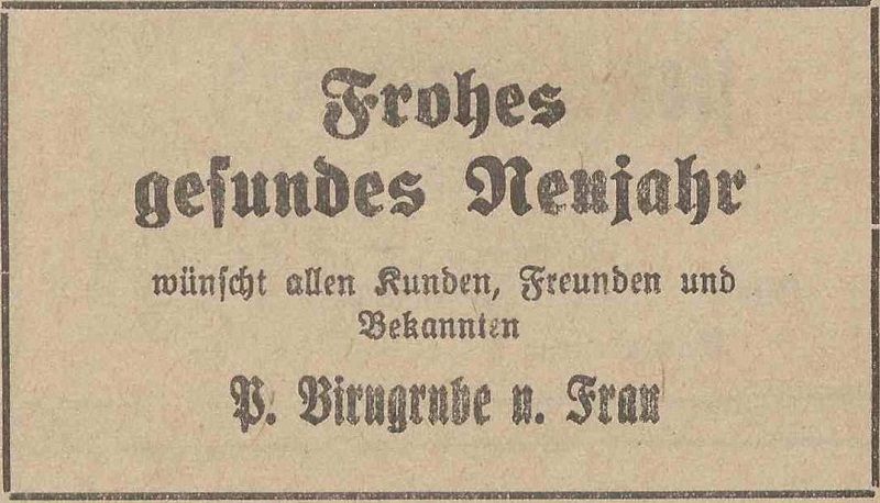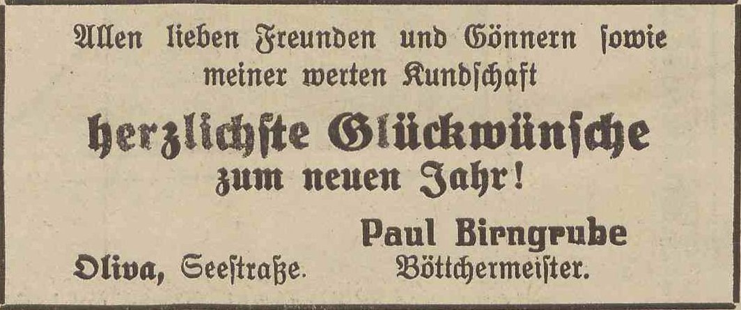 Paul Birngrube. Podziękowania noworoczne, Olivaer Zeitung nr 306 z 31. 12. 1920.