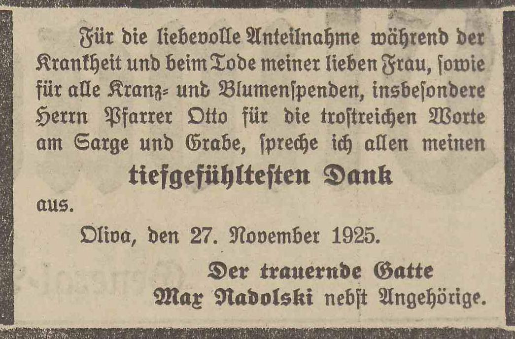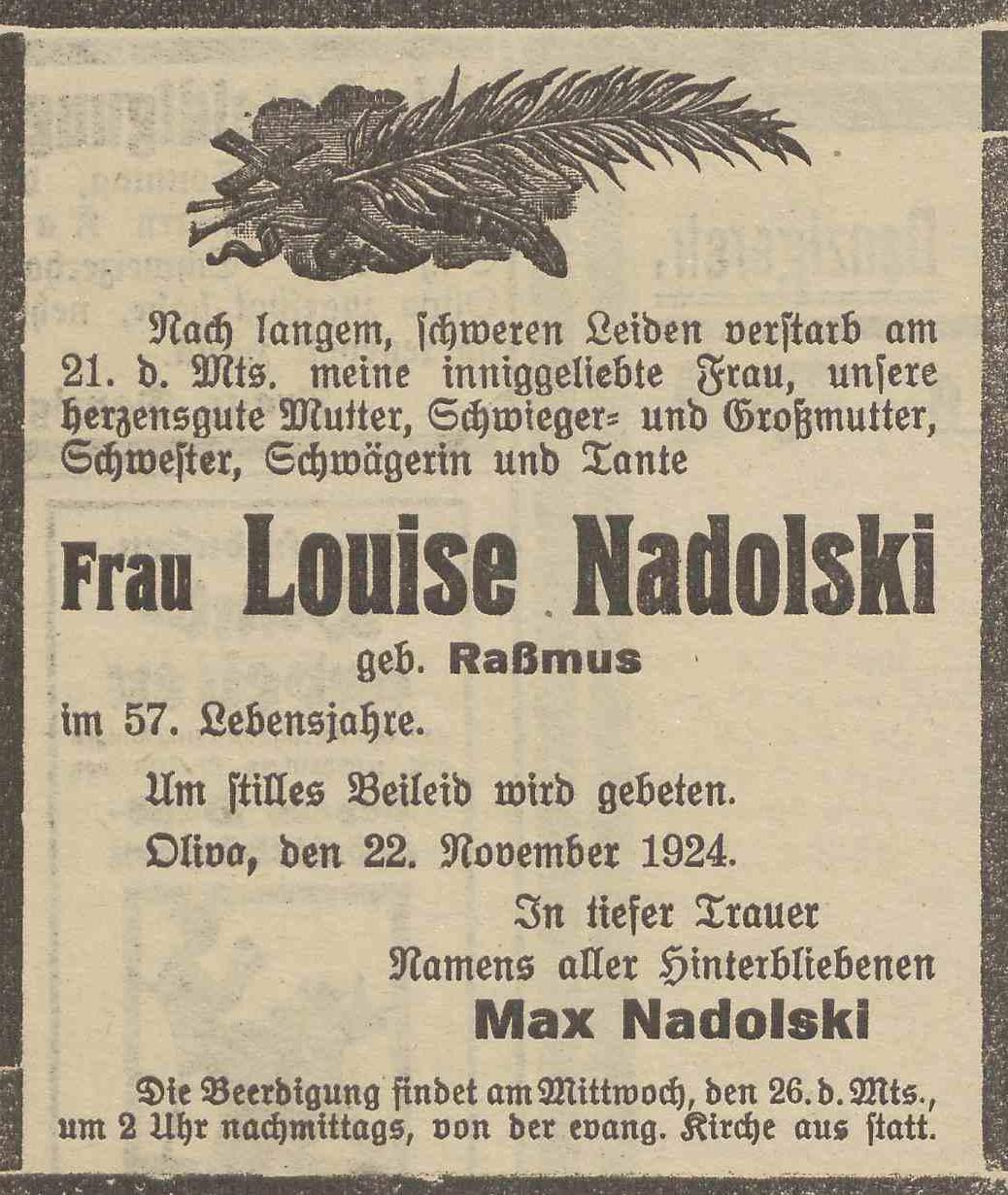Louise Nadolski zd. Raßmus. Max Nadolski. Olivaer Zeintung nr 275 z 24. 11. 1924 r.