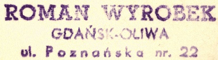 Pieczątka.Roman Wyrobek. Ul. Poznańska nr. 22.Zbiory Piotra Leżyńskiego. Zobacz: Roman Wyrobek, fotograficy, DawnaOliwa.pl Roman Wyrobek, Gedanopedia