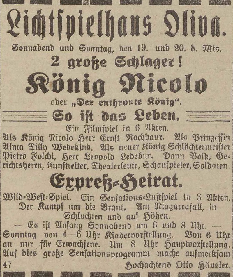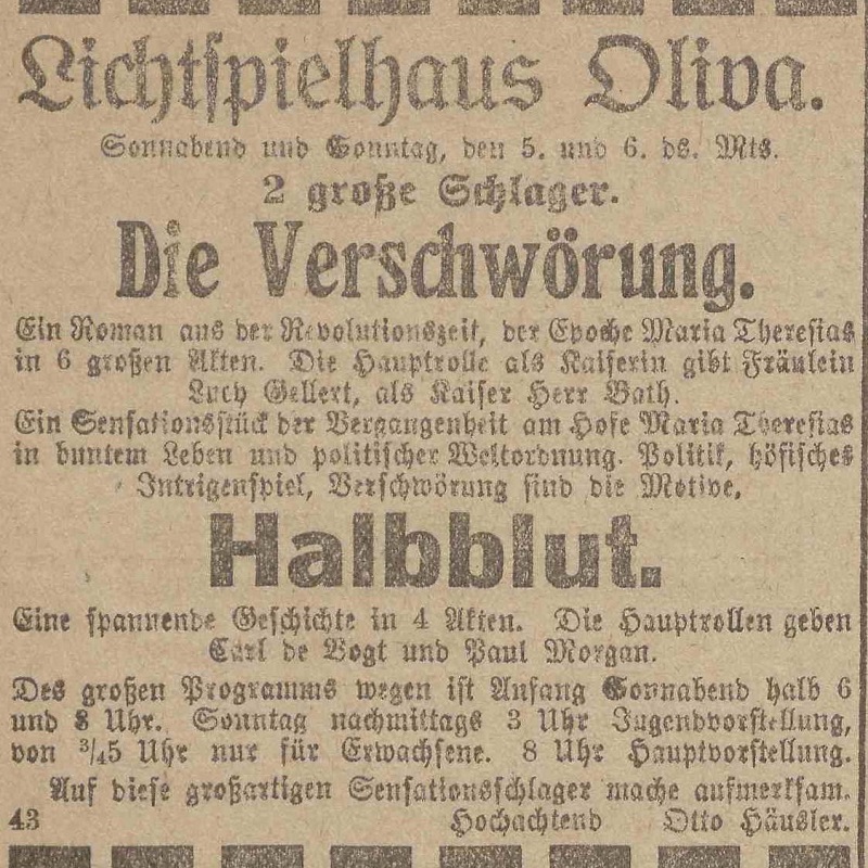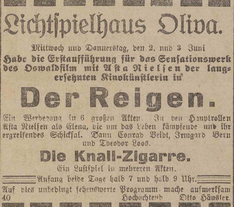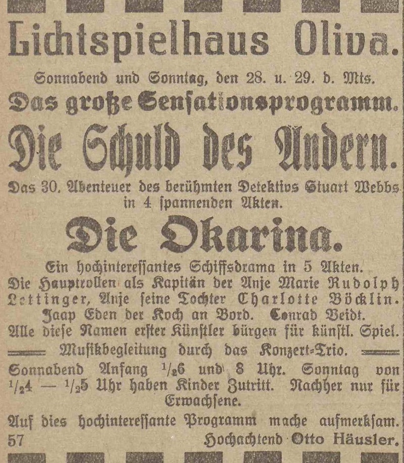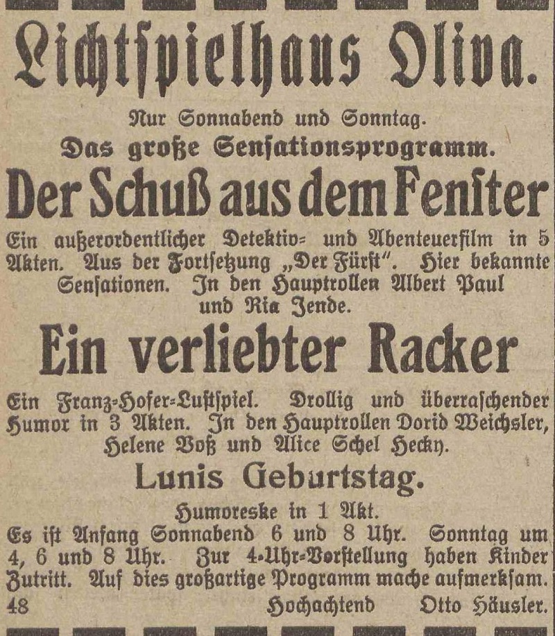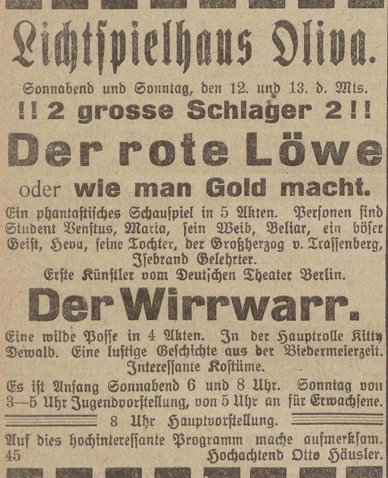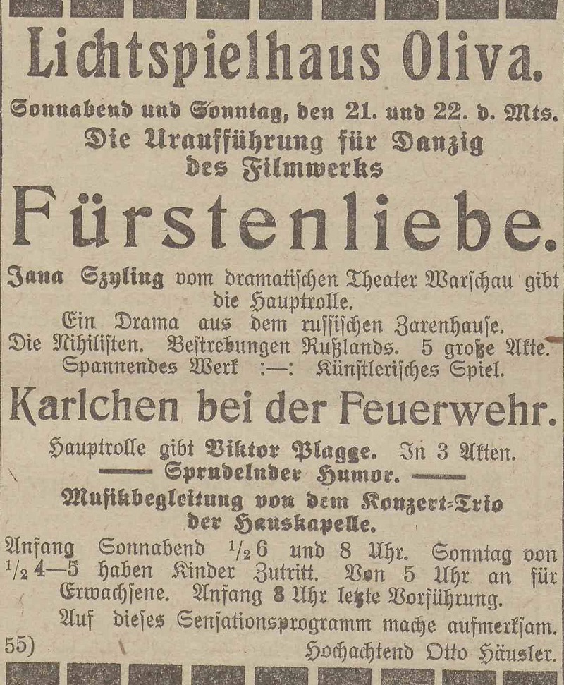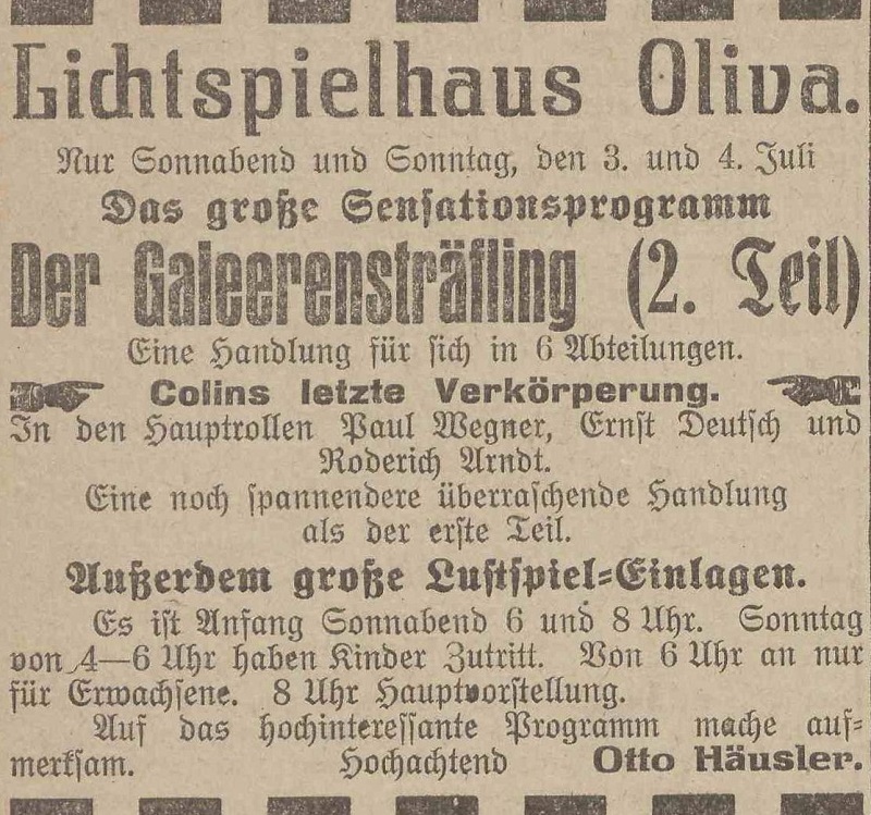 Filmy z (czerwiec-sierpień) 1920 roku ›![]() Die Knall-Zigarre. Niemiecka niema komedia z 1918 roku w reżyserii Viktora Schwanneke. Olivaer Zeintung nr 126-127 z 02-03. 06. 1920 r. ![]() Die Verschwörung. Niemiecka niema opowieść z 1919 roku w reżyserii Emila Justitza. W rolach głównych Lucy Gellert, Bath. Halbblut. Niemiecki niemy film sensacyjny z 1919 roku w reżyserii Fritza Langa. Grasją Carl de Vogt, Ressel Orla, Gilda Langer, Carl Gebhard-Schröder, Paul Morgan, Edward Eysenek. Olivaer Zeintung nr 128-129 z 04-05. 06. 1920 r. ![]() Der Kampf um die Ehe 2. Teil. Niemiecki niemy dramat z 1919 roku. Obsada: Thea Sandien, Henny Zeyn. Was den Männern gefällt. Niemiecka niema komedia z 1919 roku w reżyserii Alberta Lastmanna. Grają: Kitty Dewall, Lore Hillebrand, Ria Jende, Zitty Marwitz, Henry Bender, Julius Faltenstein, Reinhold Schünzel. Olivaer Zeintung nr 131-133 z 08-10. 06. 1920 r. ![]() Der rote Löwe oder wie man Gold macht. Sztuka w 5 aktach. Artyści z Deutsches Theatre Berlin. Der Wirrwarr Niemiecki niemy film z 1919 roku w reżyserii Karla Heine. Obsada: Wilhelm Diegelmann, Paul Conradi, Hermine Straßmann-Witt, Käte Frank, Adolf Gustav Henckels, Hugo Falke, Fritz Hurlebusch, Ria Alldorf, Kitty Dewall. Olivaer Zeintung nr 134-135 z 11-12. 06. 1920 r. ![]() Aus eines Mannes Mädchenjahren oder Das zweideutige Geschlecht. Dramat w 5 aktach. W roli głównej Erika Gläßner. Sein Störenfried. Niemiecka niema komedia z 1915 roku w reżyserii Franza Hofera. W roli głównej Dorrit Weixler. Olivaer Zeintung nr 137-139 z 15-17. 06. 1920 r. ![]() König Nicolo oder "Der enthronte König". Niemiecki niemy film z października 1919 roku w reżyserii Paula Legbanda. Obsada: Ernst Stahl-Nachbaur, Tilly Wedekind, Leopold von Ledebur, Hans Carl Mueller, Henry Bender, Paul Biensfeldt, Hans Felix, Julius Falkenstein, Max Adalbert, Paul Westermeier, Marie von Buelow, Martha Maria Newes, Fritz Jessner, Heinz Hilpert, Edgar Klitzsch, Paul Rehkopf. Expreß-Heirat. Komedia w 3 aktach. Dziki Zachód. Walka o pannę młodą przy wodospadzie Niagara. Olivaer Zeintung nr 140-141 z 18-19. 06. 1920 r. ![]() Der Schuß aus dem Feniter. Niemiecki niemy film detektywistyczno-przygodowy z 1920 roku. Grają Hans Albers, Ria Jende, Albert Paulig, Josef Reithofer, Rio Ellbon, Lotte Stein. Ein verliebter Racker. Niemiecka niema komedia z 1915 roku w reżyserii Franza Hofera. W rolach głównych Dorid Weichsler, Helene Voß i Alice Schel Hecky oraz Ernst Lubitsch i Fritz Russ. Lunis Geburtstag. Humoreska w 1 akcie. Olivaer Zeintung nr 145-147 z 24-26. 06. 1920 r. ![]() Der Galeerensträfling w dwóch częściach. Niemiecki niemy historyczny film przygodowy z 1919 roku w reżyserii Rochusa Gliese i Paula Wegenera, z udziałem Lydy Salmonovej i Paula Hartmanna. W rolach głównych Paul Wegner, Ernst Deutsch i Roderich Arndt. ![]() Olivaer Zeintung nr 151-153 z 01-03. 07. 1920 r. ![]() Olivaer Zeintung nr 180 z 04. 08. 1920 r. ![]() Tropengift. Niemiecki niemy film z listopada 1919 roku w reżyserii Hansa Schomburgka. Obsada: Meg Gehrts, Else Roscher, Leonhard Haskel, Mac Walten, Herr Anton. Das Land der Verheißung. Niemiecki niemy film z 1919/1920 roku w reżyserii Eugena Burga. W rolach głównych Eugen Burg, Hans Ahrens, Hugo Flink, Otto Härtling, Wanda Treumann. Akompaniament muzyczny: trio artystyczne Mühlhoff. Olivaer Zeintung nr 181-183 z 05-07. 08. 1920 r. ![]() Der Schrei um Hilfe. Niemiecki niemy dramat detektywistyczny z 1920 roku w reżyserii Jaapa Speyera. Aktorzy: Bruno Eichgrün, Evi Eva, Fritz Achterberg, Fritz Hartwig, Erwin Fichtner. Das Land der Verheißung. Niemiecki niemy film z 1919/1920 roku w reżyserii Eugena Burga. W rolach głównych Eugen Burg, Hans Ahrens, Hugo Flink, Otto Härtling, Wanda Treumann. Akompaniament muzyczny: trio artystyczne Mühlhoff. Olivaer Zeintung nr 185-187 z 10-12. 08. 1920 r. ![]() Harakiri. Niemiecki niemy dramat z 1919 roku w reżyserii Fritza Langa. Obsada: Niels Prien, Paul Biensfeldt, Erner Huebsch, Lil Dagover, Georg John, Kaete Juster, Meinhart Maur, Rudolf Lettinger, Loni Nest, Herta Heden, Harry Frank. Olivaer Zeintung nr 188-189 z 13-14. 08. 1920 r. ![]() Die Kronjuwelen des Herzogs von Rochester. Niemiecki niemy film przygodowy z 1920 roku w reżyserii Paula Legbanda. W roli głównej jako książę Johannes Riemann. Obsada: Hans Albers, Edward Eyseneck, Jaro Fürth, Ria Jende, Helmuth Krüger, Maria Merlott, Joseph Römer. Der Paladin. Dramat kryminalny. W rolach głównych występują Emmy Kaiser i Sybill Smolows. Olivaer Zeintung nr 191-193 z 17-19. 08. 1920 r. ![]() Fürstenliebe. Niemiecki niemy film fabularny z 1919 roku. W roli głównej Jana Szyling z Warszawskiego Teatru Dramatycznego. Karlchen bei der Feuerwehr. Niemiecki niemy film z 1919 roku w reżyserii Emila Albesa. Obsada: Frau Arnold, Mia Greder, Kurt Wolfram Kiesslich, Karl Victor Plagge, Marlis Rottach, Guido Schützendorf, Ilse Wilke. Olivaer Zeintung nr 194-195 z 20-21. 08. 1920 r. ![]() Die Sumpfhanne. Niemiecki niemy dramat z 1919 roku w reżyserii Carla Boese. W roli głównej Charlotte Böcklin. Obsada: Ferdinand von Alten, Hella Thornegg, Friedrich Kühne, Karl Falkenberg, Ernst Dernburg. Die feindlichen Reporter. Niemiecki niemy film z 1919 roku w reżyserii Franza Hofera. W roli głównej Rudi Wehr w roli księżniczki Jua von Schnackenberg. Grają Karl Elzer i Fred Kronström. Olivaer Zeintung nr 197-199 z 24-26. 08. 1920 r. ![]() Die Schuld des Andern. Niemeicki niemy film z 1920 roku w reżyserii Rolfa Brunnera. Grają: Maria Forescu, Harry Frank, Willy Kaiser-Heyl, Ressel Orla, Alfred Scherzer, Emmy Sturm, Hans Walden, Max Wogritsch. Die Okarina. Niemiecki niemy dramat z 1919 roku wyreżyserowany przez Uwe Jensa Kraffta. Główne role grają Charlotte Böcklin, Rudolf Lettinger, Conrad Veidt. Olivaer Zeintung nr 200 z 27. 08. 1920 r. ![]()