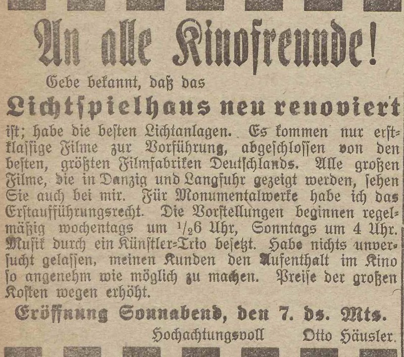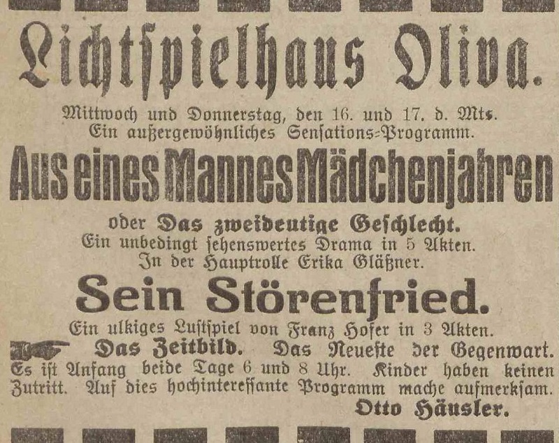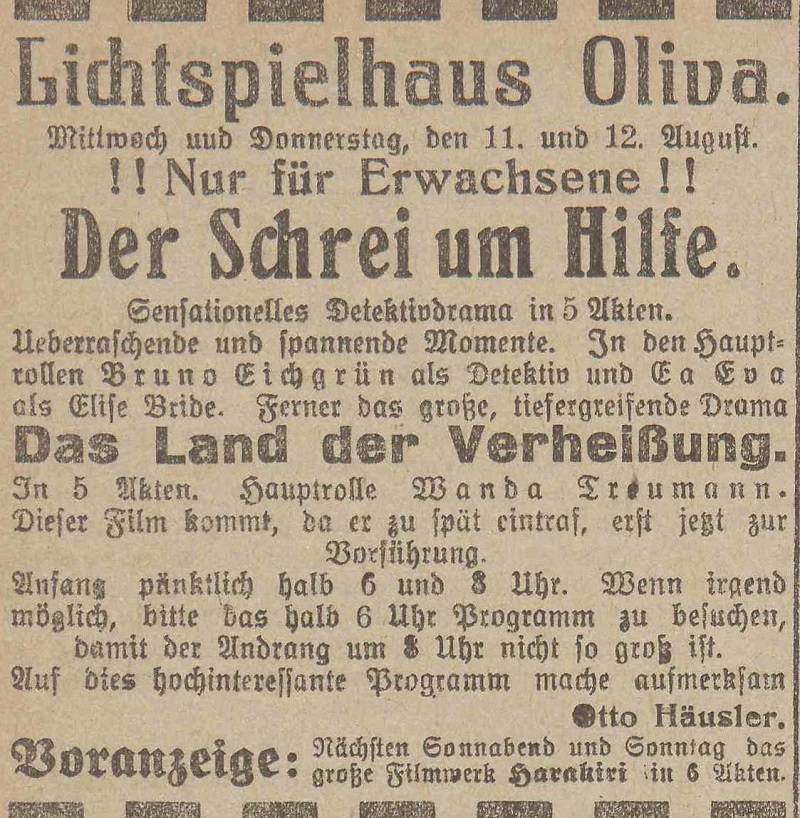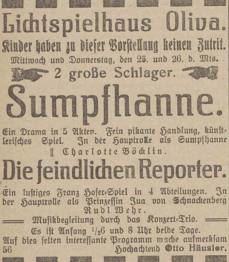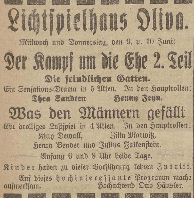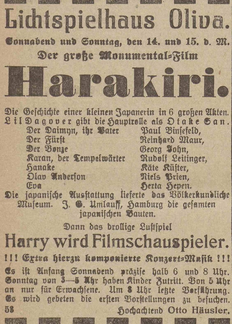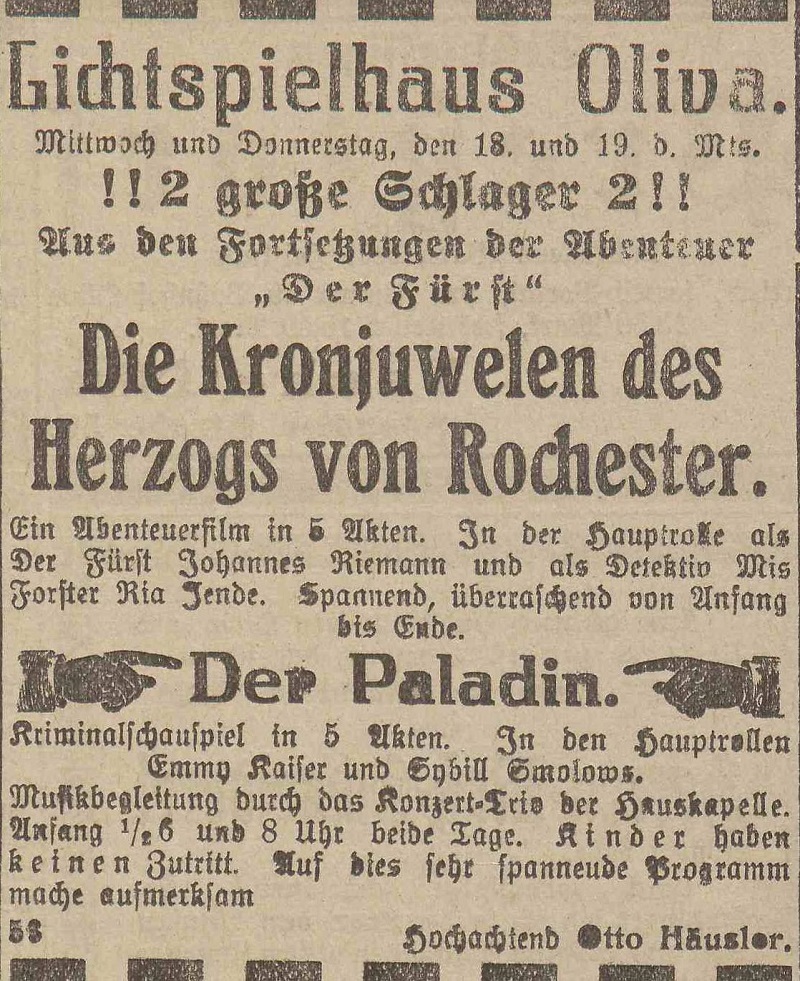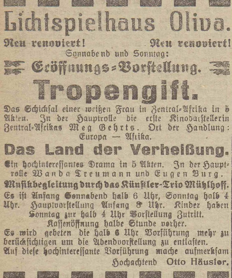 Filmy z (czerwiec-sierpień) 1920 roku ›![]() Die Knall-Zigarre. Niemiecka niema komedia z 1918 roku w reżyserii Viktora Schwanneke. Olivaer Zeintung nr 126-127 z 02-03. 06. 1920 r. ![]() Die Verschwörung. Niemiecka niema opowieść z 1919 roku w reżyserii Emila Justitza. W rolach głównych Lucy Gellert, Bath. Halbblut. Niemiecki niemy film sensacyjny z 1919 roku w reżyserii Fritza Langa. Grasją Carl de Vogt, Ressel Orla, Gilda Langer, Carl Gebhard-Schröder, Paul Morgan, Edward Eysenek. Olivaer Zeintung nr 128-129 z 04-05. 06. 1920 r. ![]() Der Kampf um die Ehe 2. Teil. Niemiecki niemy dramat z 1919 roku. Obsada: Thea Sandien, Henny Zeyn. Was den Männern gefällt. Niemiecka niema komedia z 1919 roku w reżyserii Alberta Lastmanna. Grają: Kitty Dewall, Lore Hillebrand, Ria Jende, Zitty Marwitz, Henry Bender, Julius Faltenstein, Reinhold Schünzel. Olivaer Zeintung nr 131-133 z 08-10. 06. 1920 r. ![]() Der rote Löwe oder wie man Gold macht. Sztuka w 5 aktach. Artyści z Deutsches Theatre Berlin. Der Wirrwarr Niemiecki niemy film z 1919 roku w reżyserii Karla Heine. Obsada: Wilhelm Diegelmann, Paul Conradi, Hermine Straßmann-Witt, Käte Frank, Adolf Gustav Henckels, Hugo Falke, Fritz Hurlebusch, Ria Alldorf, Kitty Dewall. Olivaer Zeintung nr 134-135 z 11-12. 06. 1920 r. ![]() Aus eines Mannes Mädchenjahren oder Das zweideutige Geschlecht. Dramat w 5 aktach. W roli głównej Erika Gläßner. Sein Störenfried. Niemiecka niema komedia z 1915 roku w reżyserii Franza Hofera. W roli głównej Dorrit Weixler. Olivaer Zeintung nr 137-139 z 15-17. 06. 1920 r. ![]() König Nicolo oder "Der enthronte König". Niemiecki niemy film z października 1919 roku w reżyserii Paula Legbanda. Obsada: Ernst Stahl-Nachbaur, Tilly Wedekind, Leopold von Ledebur, Hans Carl Mueller, Henry Bender, Paul Biensfeldt, Hans Felix, Julius Falkenstein, Max Adalbert, Paul Westermeier, Marie von Buelow, Martha Maria Newes, Fritz Jessner, Heinz Hilpert, Edgar Klitzsch, Paul Rehkopf. Expreß-Heirat. Komedia w 3 aktach. Dziki Zachód. Walka o pannę młodą przy wodospadzie Niagara. Olivaer Zeintung nr 140-141 z 18-19. 06. 1920 r. ![]() Der Schuß aus dem Feniter. Niemiecki niemy film detektywistyczno-przygodowy z 1920 roku. Grają Hans Albers, Ria Jende, Albert Paulig, Josef Reithofer, Rio Ellbon, Lotte Stein. Ein verliebter Racker. Niemiecka niema komedia z 1915 roku w reżyserii Franza Hofera. W rolach głównych Dorid Weichsler, Helene Voß i Alice Schel Hecky oraz Ernst Lubitsch i Fritz Russ. Lunis Geburtstag. Humoreska w 1 akcie. Olivaer Zeintung nr 145-147 z 24-26. 06. 1920 r. ![]() Der Galeerensträfling w dwóch częściach. Niemiecki niemy historyczny film przygodowy z 1919 roku w reżyserii Rochusa Gliese i Paula Wegenera, z udziałem Lydy Salmonovej i Paula Hartmanna. W rolach głównych Paul Wegner, Ernst Deutsch i Roderich Arndt. ![]() Olivaer Zeintung nr 151-153 z 01-03. 07. 1920 r. ![]() Olivaer Zeintung nr 180 z 04. 08. 1920 r. ![]() Tropengift. Niemiecki niemy film z listopada 1919 roku w reżyserii Hansa Schomburgka. Obsada: Meg Gehrts, Else Roscher, Leonhard Haskel, Mac Walten, Herr Anton. Das Land der Verheißung. Niemiecki niemy film z 1919/1920 roku w reżyserii Eugena Burga. W rolach głównych Eugen Burg, Hans Ahrens, Hugo Flink, Otto Härtling, Wanda Treumann. Akompaniament muzyczny: trio artystyczne Mühlhoff. Olivaer Zeintung nr 181-183 z 05-07. 08. 1920 r. ![]() Der Schrei um Hilfe. Niemiecki niemy dramat detektywistyczny z 1920 roku w reżyserii Jaapa Speyera. Aktorzy: Bruno Eichgrün, Evi Eva, Fritz Achterberg, Fritz Hartwig, Erwin Fichtner. Das Land der Verheißung. Niemiecki niemy film z 1919/1920 roku w reżyserii Eugena Burga. W rolach głównych Eugen Burg, Hans Ahrens, Hugo Flink, Otto Härtling, Wanda Treumann. Akompaniament muzyczny: trio artystyczne Mühlhoff. Olivaer Zeintung nr 185-187 z 10-12. 08. 1920 r. ![]() Harakiri. Niemiecki niemy dramat z 1919 roku w reżyserii Fritza Langa. Obsada: Niels Prien, Paul Biensfeldt, Erner Huebsch, Lil Dagover, Georg John, Kaete Juster, Meinhart Maur, Rudolf Lettinger, Loni Nest, Herta Heden, Harry Frank. Olivaer Zeintung nr 188-189 z 13-14. 08. 1920 r. ![]() Die Kronjuwelen des Herzogs von Rochester. Niemiecki niemy film przygodowy z 1920 roku w reżyserii Paula Legbanda. W roli głównej jako książę Johannes Riemann. Obsada: Hans Albers, Edward Eyseneck, Jaro Fürth, Ria Jende, Helmuth Krüger, Maria Merlott, Joseph Römer. Der Paladin. Dramat kryminalny. W rolach głównych występują Emmy Kaiser i Sybill Smolows. Olivaer Zeintung nr 191-193 z 17-19. 08. 1920 r. ![]() Fürstenliebe. Niemiecki niemy film fabularny z 1919 roku. W roli głównej Jana Szyling z Warszawskiego Teatru Dramatycznego. Karlchen bei der Feuerwehr. Niemiecki niemy film z 1919 roku w reżyserii Emila Albesa. Obsada: Frau Arnold, Mia Greder, Kurt Wolfram Kiesslich, Karl Victor Plagge, Marlis Rottach, Guido Schützendorf, Ilse Wilke. Olivaer Zeintung nr 194-195 z 20-21. 08. 1920 r. ![]() Die Sumpfhanne. Niemiecki niemy dramat z 1919 roku w reżyserii Carla Boese. W roli głównej Charlotte Böcklin. Obsada: Ferdinand von Alten, Hella Thornegg, Friedrich Kühne, Karl Falkenberg, Ernst Dernburg. Die feindlichen Reporter. Niemiecki niemy film z 1919 roku w reżyserii Franza Hofera. W roli głównej Rudi Wehr w roli księżniczki Jua von Schnackenberg. Grają Karl Elzer i Fred Kronström. Olivaer Zeintung nr 197-199 z 24-26. 08. 1920 r. ![]() Die Schuld des Andern. Niemeicki niemy film z 1920 roku w reżyserii Rolfa Brunnera. Grają: Maria Forescu, Harry Frank, Willy Kaiser-Heyl, Ressel Orla, Alfred Scherzer, Emmy Sturm, Hans Walden, Max Wogritsch. Die Okarina. Niemiecki niemy dramat z 1919 roku wyreżyserowany przez Uwe Jensa Kraffta. Główne role grają Charlotte Böcklin, Rudolf Lettinger, Conrad Veidt. Olivaer Zeintung nr 200 z 27. 08. 1920 r. ![]()