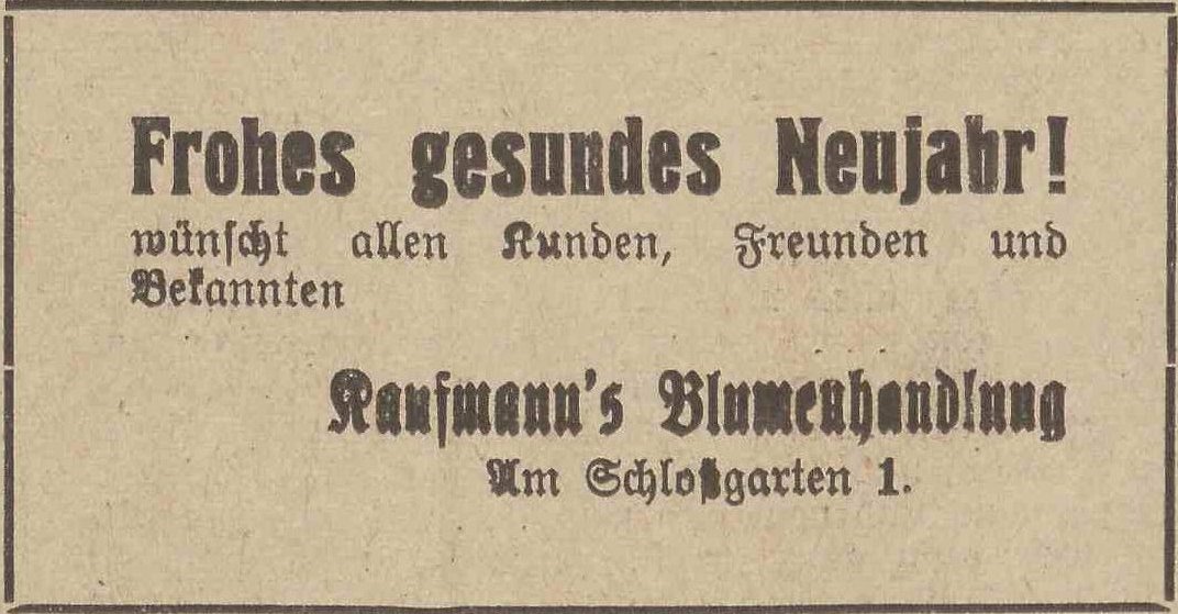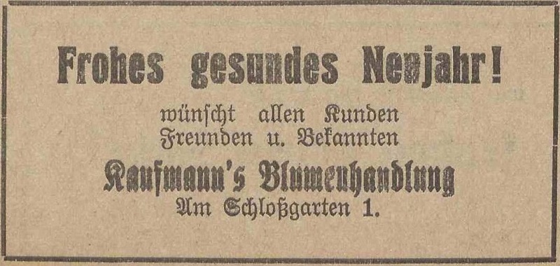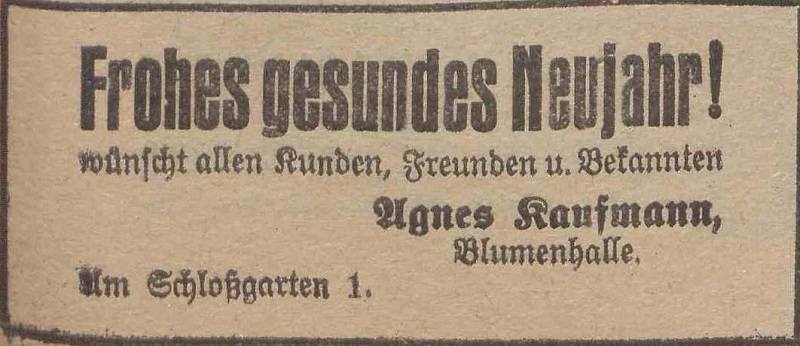 Agnes Kaufmann, Blumenhalle, Am Schloßgarten 1A. Podziękowania noworoczne, Olivaer Zeitung nr 306 z 31. 12. 1928.