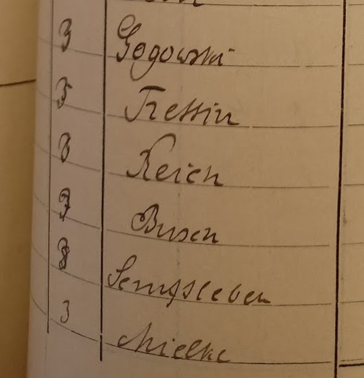 Köllner Chaussee 3: Gogowski, Hellin, Keich?, Busch, Senstleben, Chielke?. Spis z 1895 roku. Przekazała Grażyna Niemyjska.