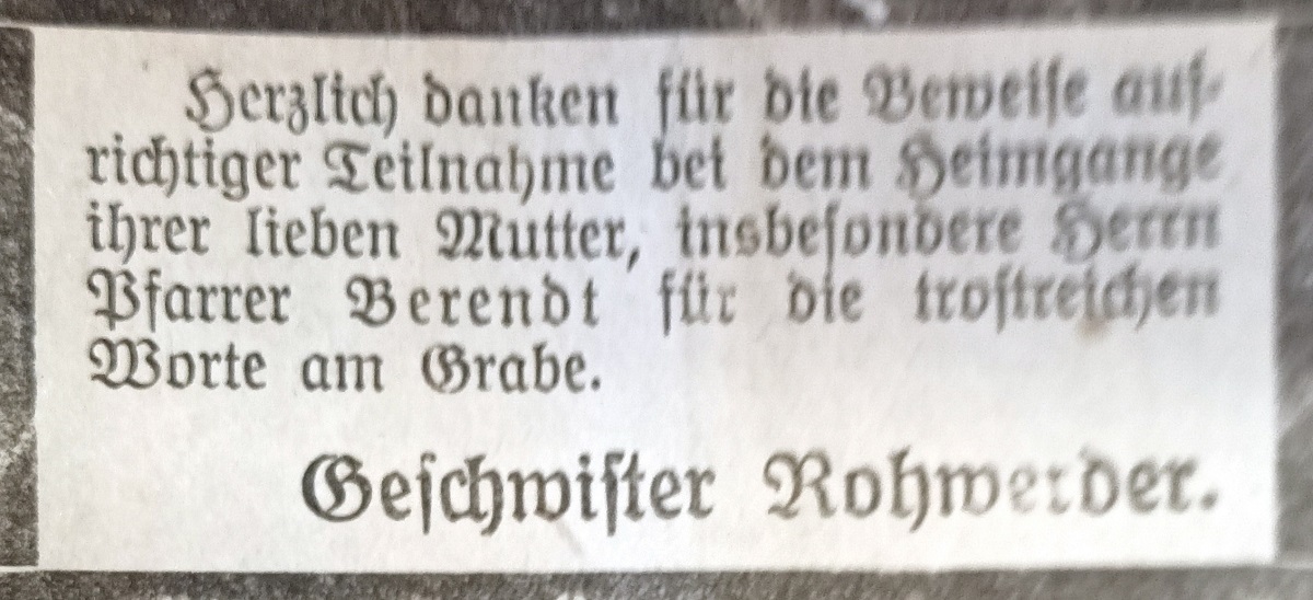 Elisabeth Rohwerder zd. Werner. Danziger Kreis-Zeitung 1922. Przekazała Grażyna Niemyjska.