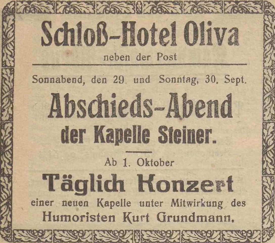Schloß-Hotel Oliva. Olivaer Zeintung nr 226 z 28. 09. 1923 r.