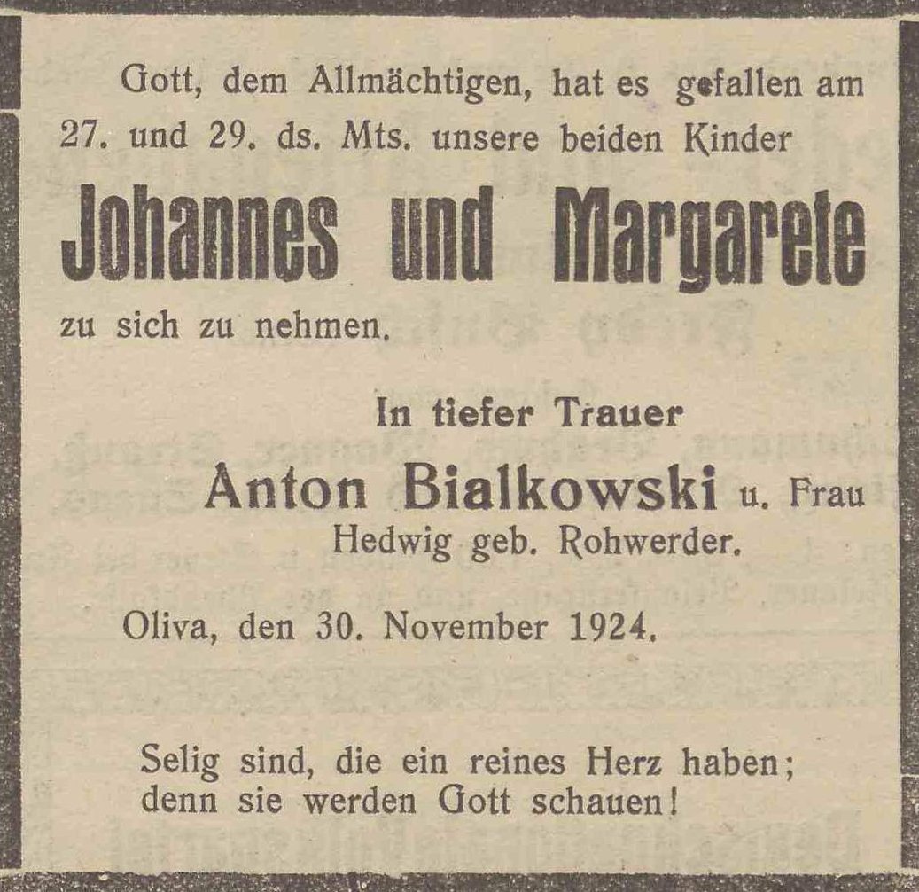 Johannes Bialkowski. Margarete Bialkowski. Antoni Bialkowski. Hedwig Bialkowski zd. Rohwerder. Olivaer Zeintung nr 282 z 01. 12. 1924 r.