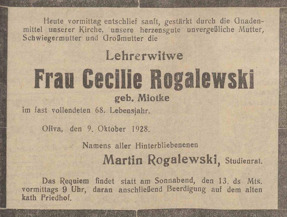 Cecylie Rogalewki zd. Miotke. Martin Rogalewki. Olivaer Zeintung nr 239 z 10. 10. 1928 r.