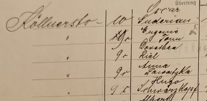 Köllner Chaussee: 10: Suderian?, 9a: ..., 9a: ..., 9b: ..., 9c: ... . Spis z 1895 roku. Przekazała Grażyna Niemyjska.