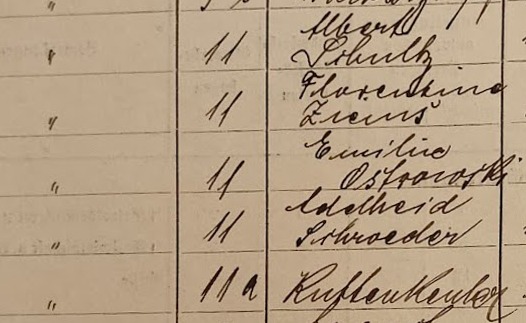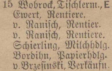 Köllner Chaussee 11: ..., ..., Ostrowski, Sdroeder, ... . Spis z 1895 roku. Przekazała Grażyna Niemyjska.