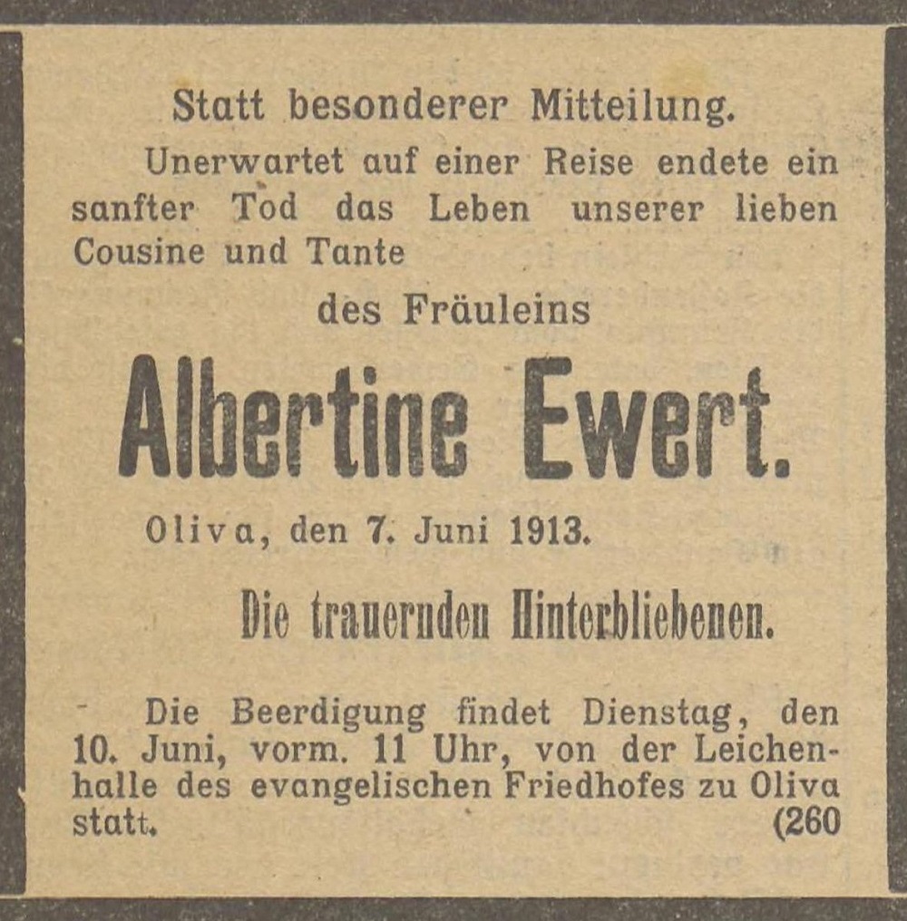 Albertine Ewert. Olivaer Nachrichten nr 67 z 06. 10. 1913 r. Ze strony Polona.pl.