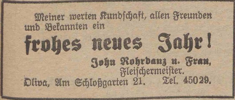 John Rohrdanz, Fleischermeister. Podziękowania noworoczne, Olivaer Zeitung nr 305 z 31. 12. 1929.