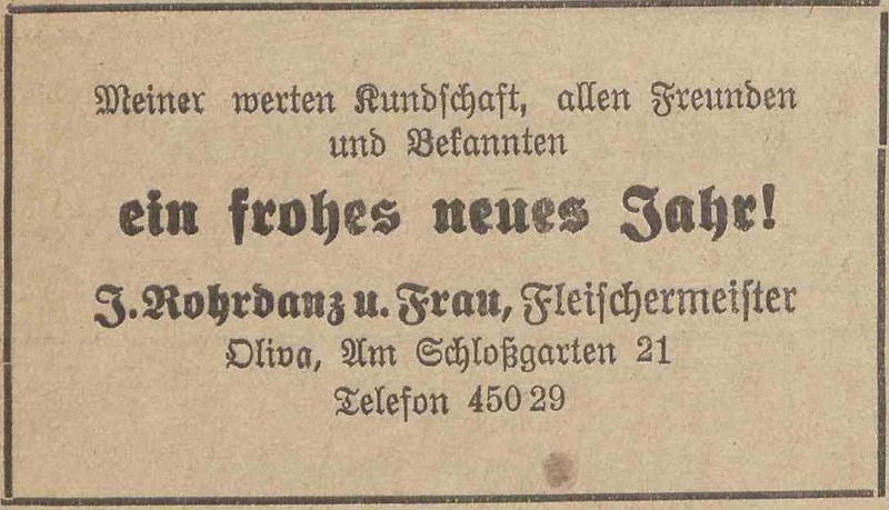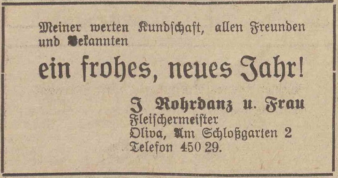 John Rohrdanz, Fleischermeister. Podziękowania noworoczne, Danzig-Olivaer Zeitung nr 305 z 31. 12. 1932.