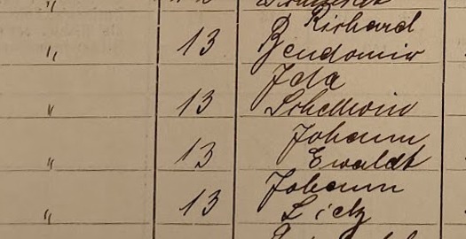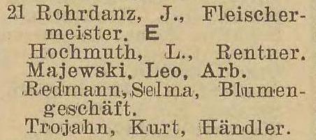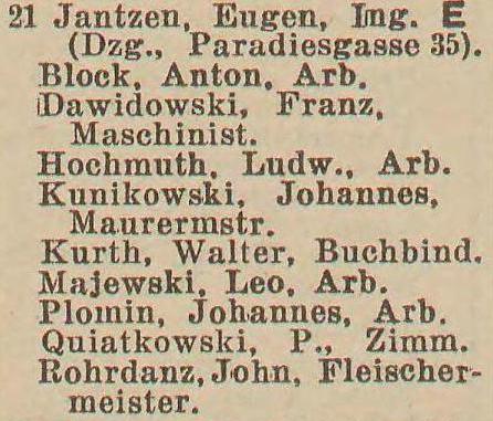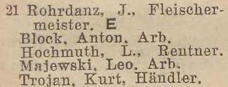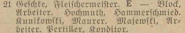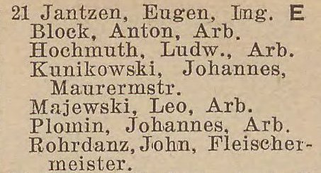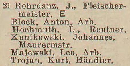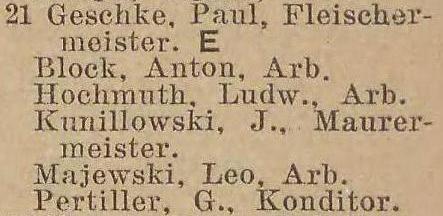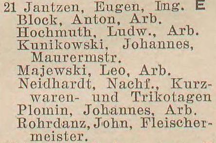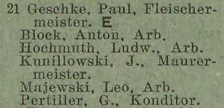 Köllner Chaussee 13: Bendomir, ..., Ewaldt?, Lietz? . Spis z 1895 roku. Przekazała Grażyna Niemyjska.