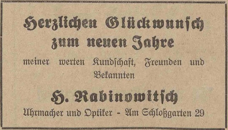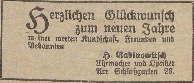 Henrich Rabinowitsch, Uhrmacher und Optiker. Podziękowania noworoczne, Olivaer Zeitung nr 306 z 31. 12. 1928.