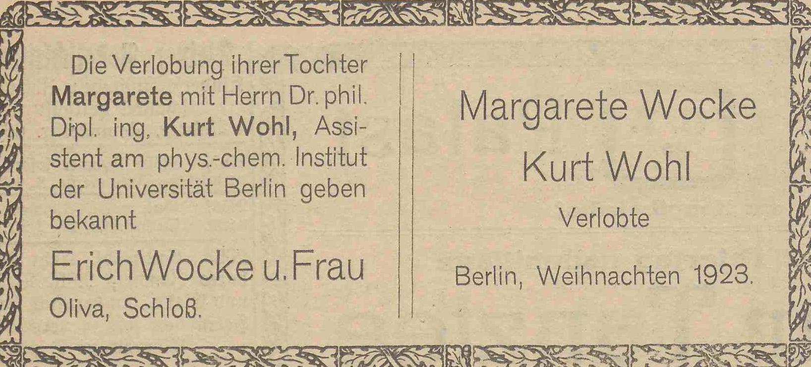 Margaretr Wohl zd. Wocke. Kurt Wohl. Erich Wocke. Olivaer Zeintung nr 299 z 24. 12. 1923 r.