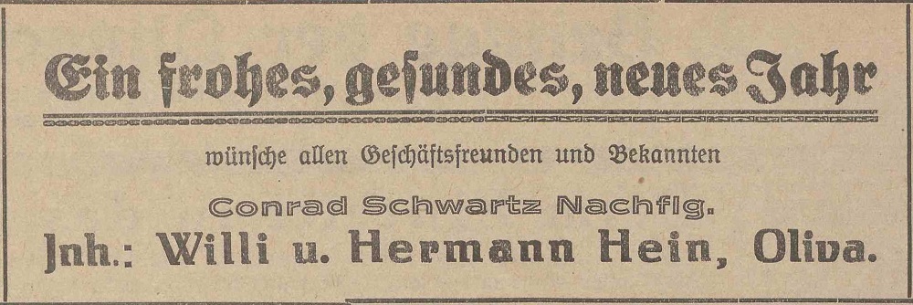 Conrad Schwartz Nachfolger, Willy und Hermann Hein. Podziękowania noworoczne, Olivaer Zeitung nr 305 z 31. 12. 1929.