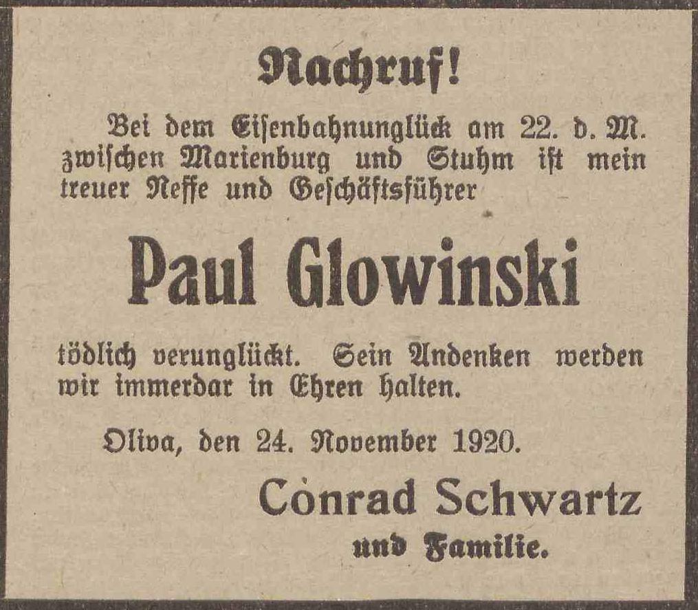 Konrad Schwarz. Ladestraße 1. Olivaer Zeintung nr 148 z 28. 06. 1920 r.