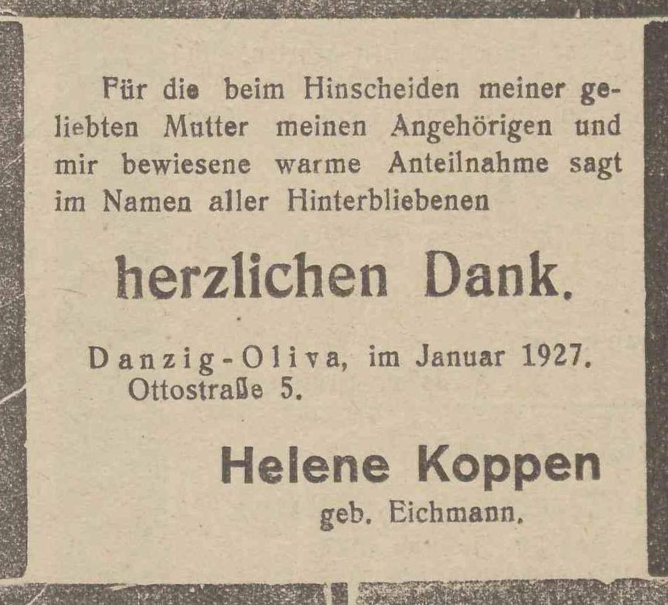 Śmierć matki Helene Koppen zd. Eichmann. Olivaer Zeintung nr 20 z 25. 01. 1927 r.