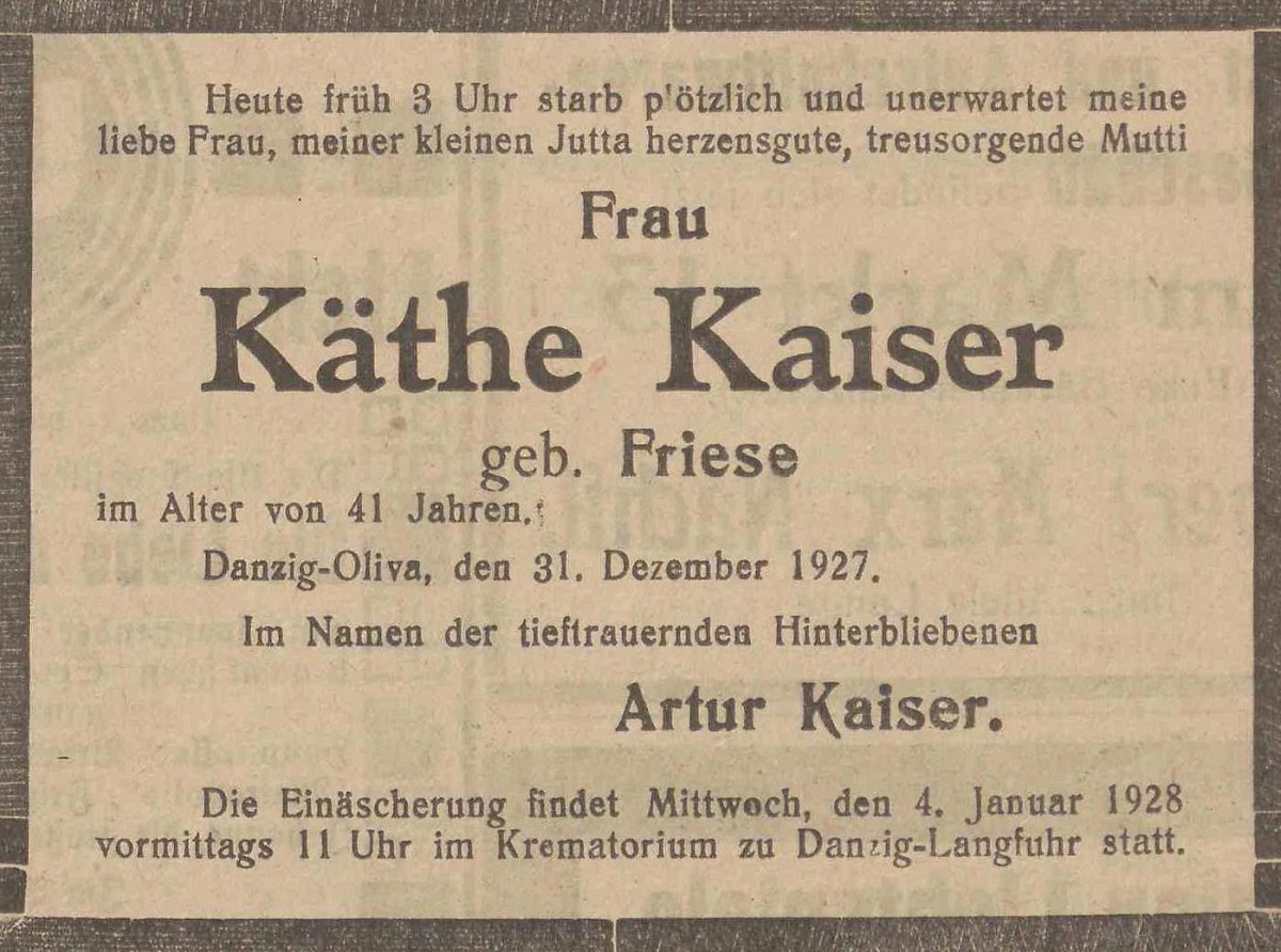 Käthe Kaiser zd. Friese. Artur Kaiser. Olivaer Zeintung nr 2 z 03. 01. 1928 r.