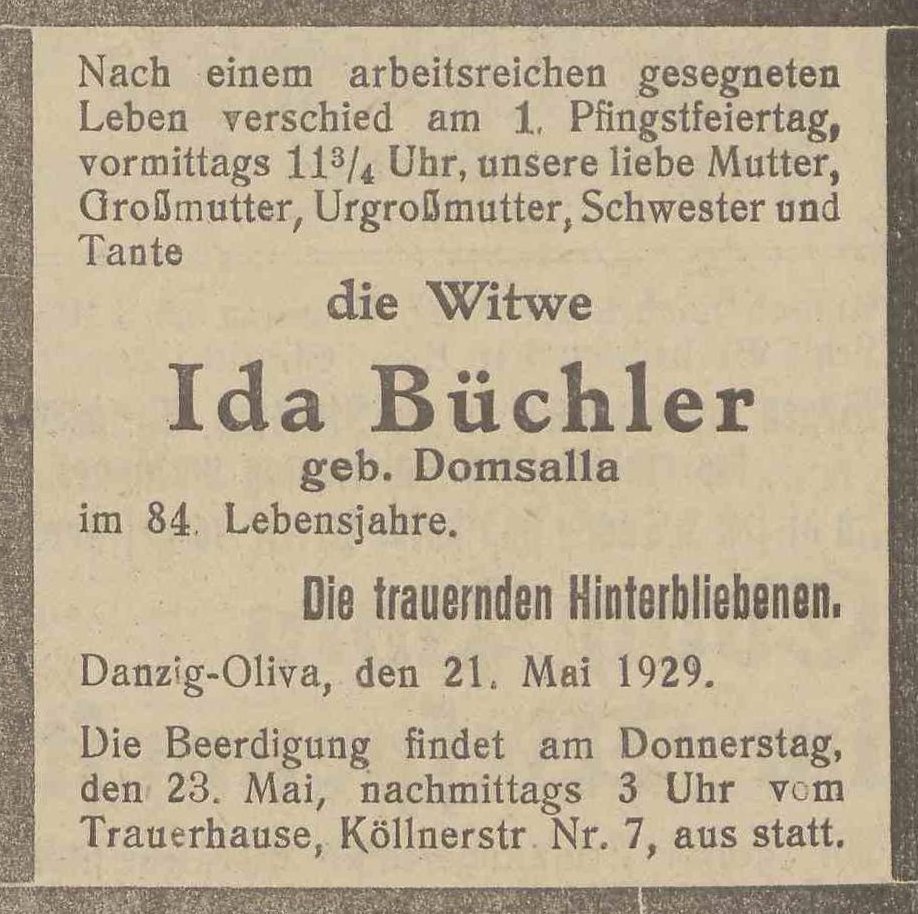 Ida Büchler zd. Domsalla. Olivaer Zeintung nr 116 z 21. 05. 1929 r.