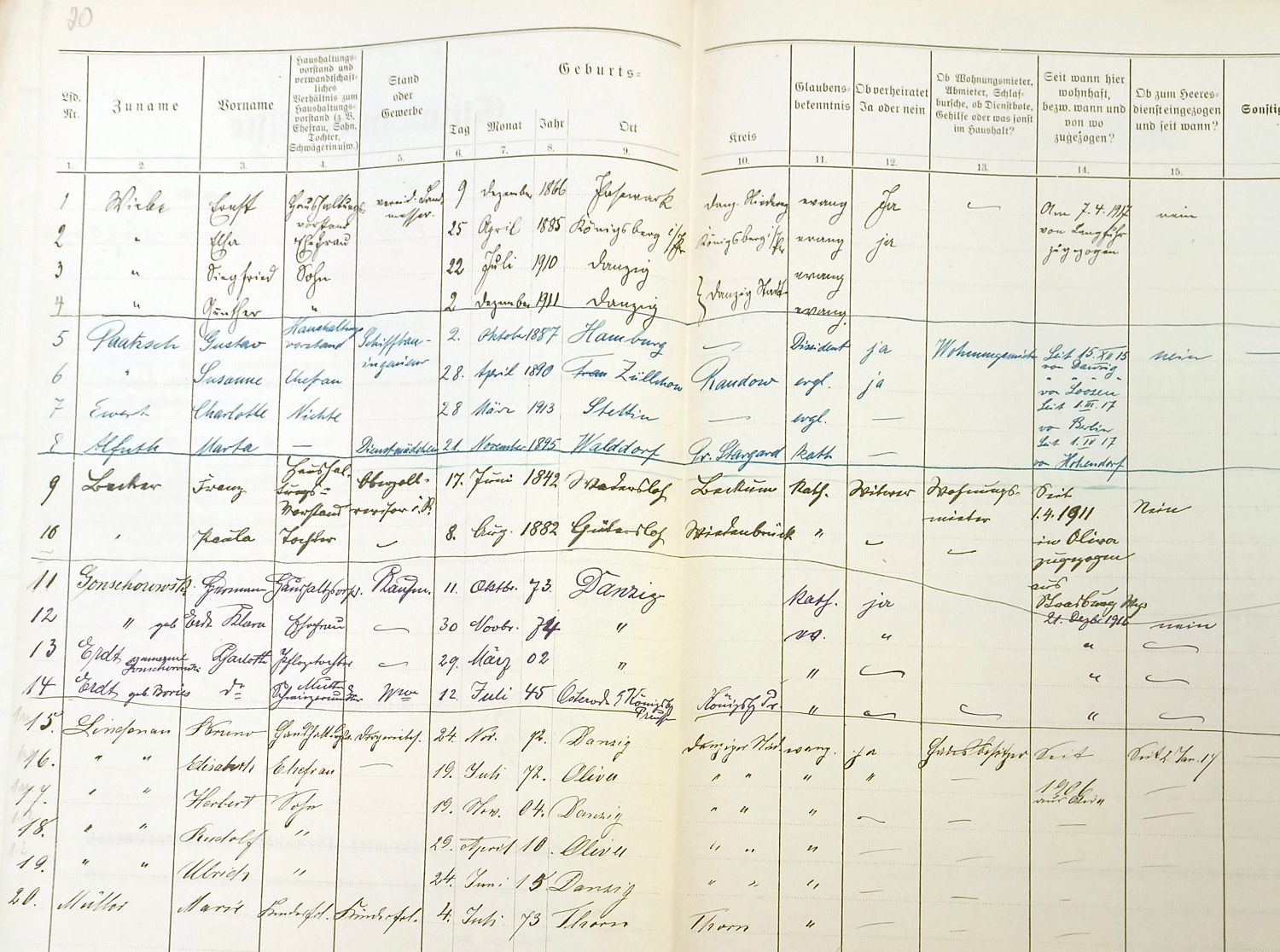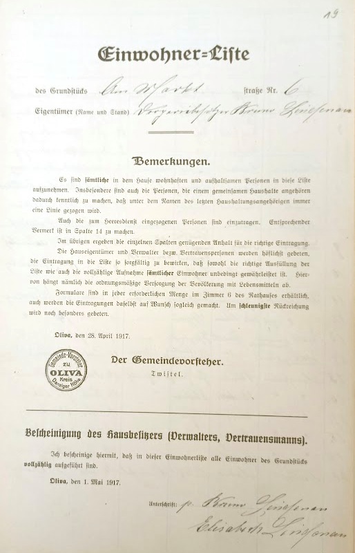 Spis z 1917 roku › Zbiory: Archiwum Państwowe w Gdańsku - sygnatura: APG 760/594 Przekazała Grażyna Niemyjska (19) Am Markt 6. Właściciel: Bruno Lindenau, Elisabeth Lindenau. ![]() (20) Am Markt 6. Mieszkańcy: Wiebe, ..., ..., ..., Becker, ..., Lindenau, Mühle. ![]()