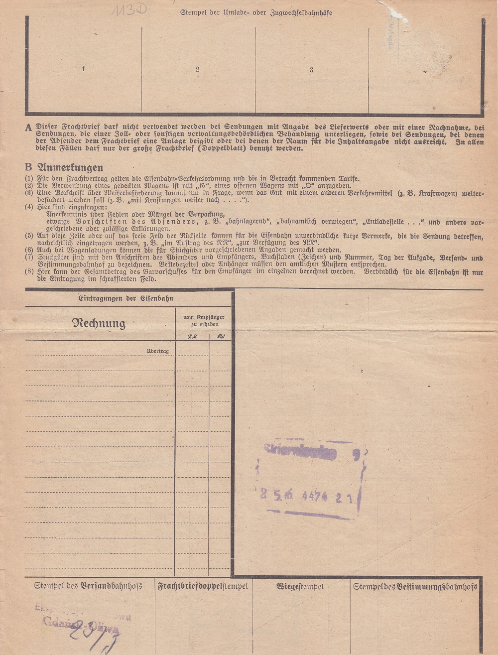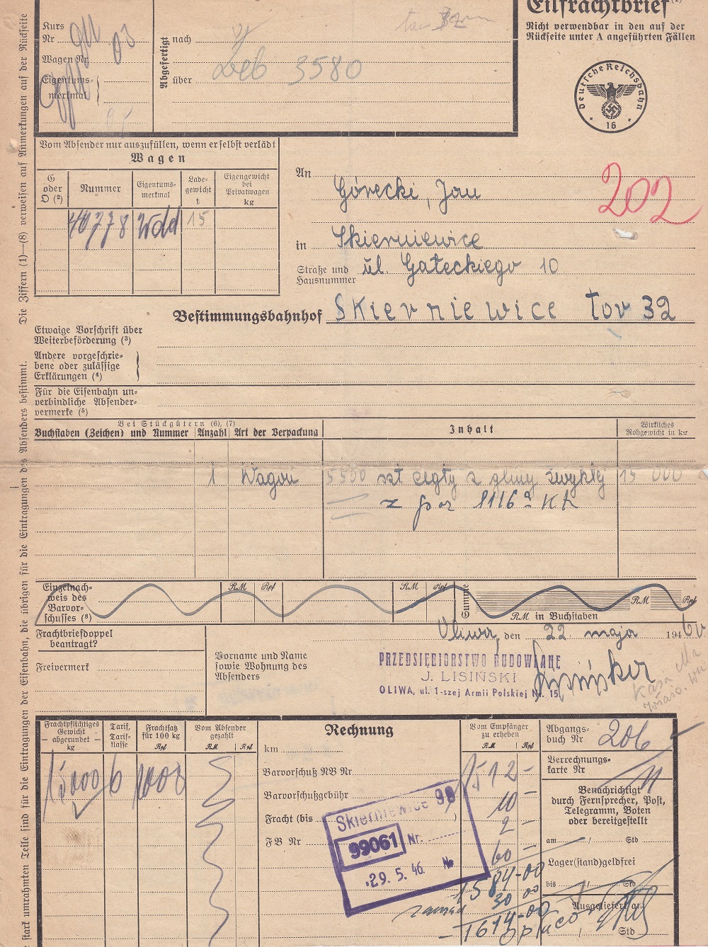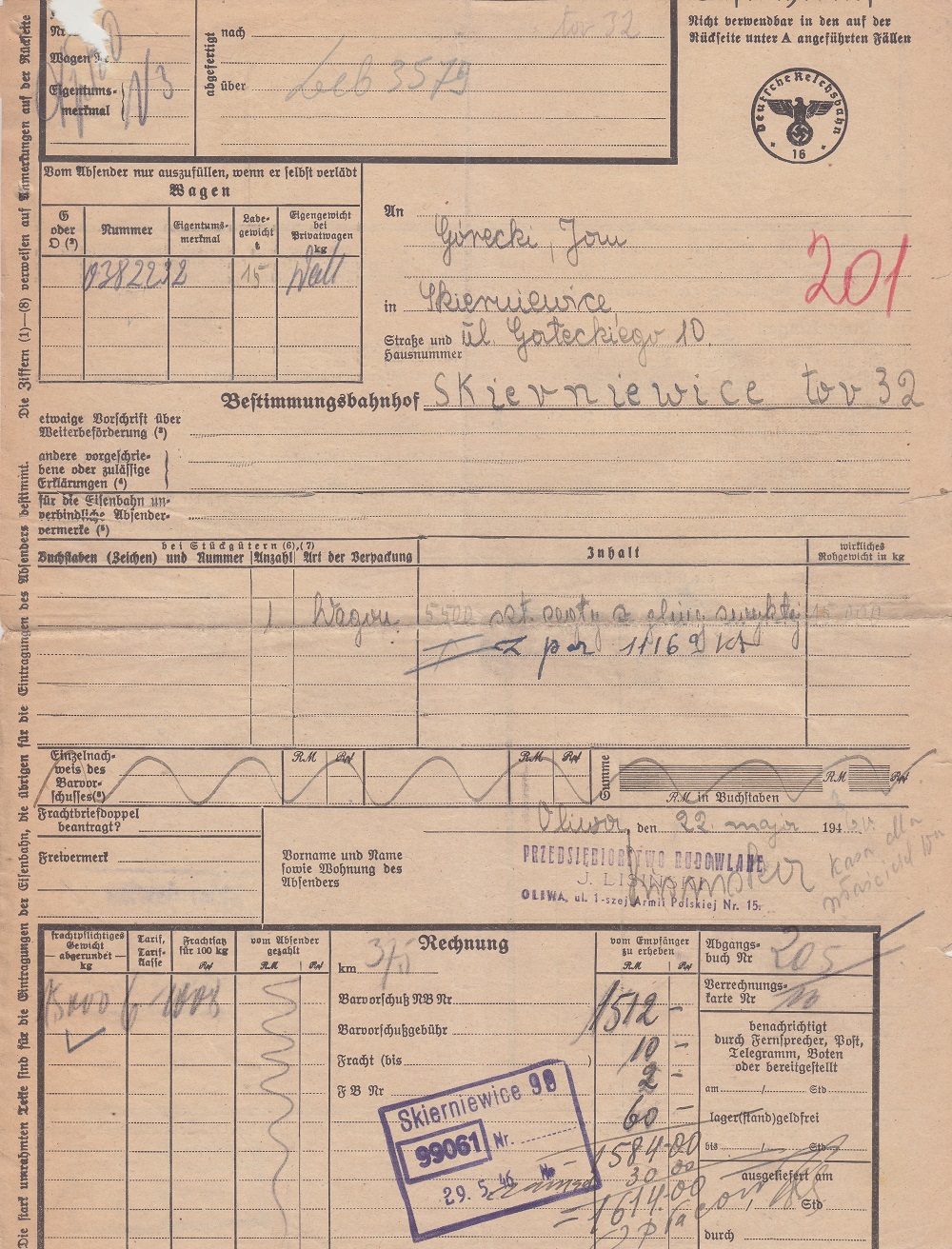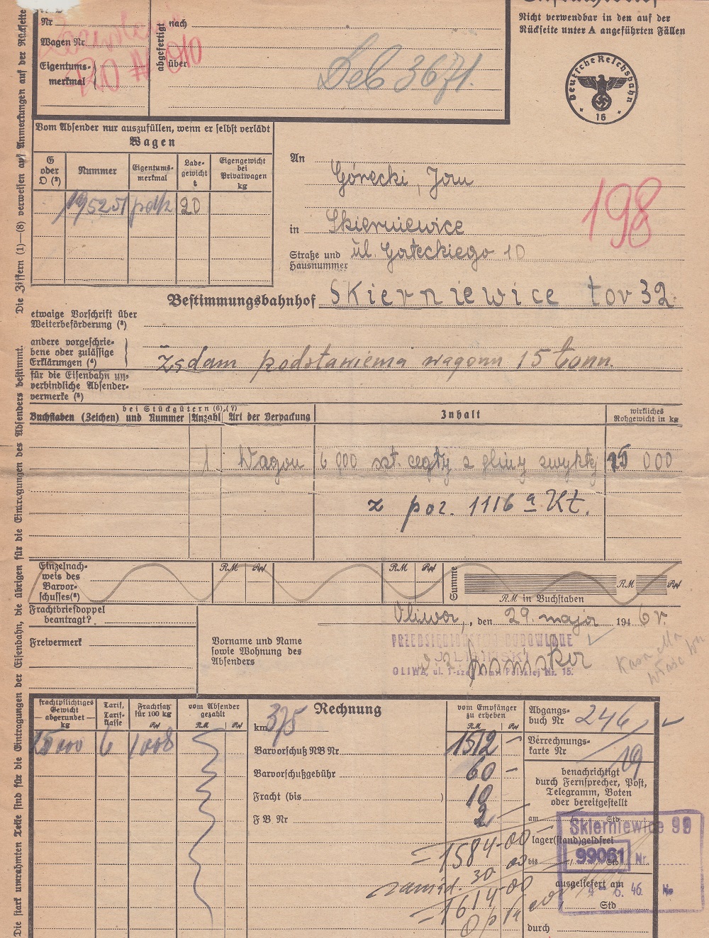 Nadano (Ekspedycja Towarowa Gdańsk-Oliwa): 5.000 sztuk cegły z gliny zwykłej wagonem o tonażu 15 ton.