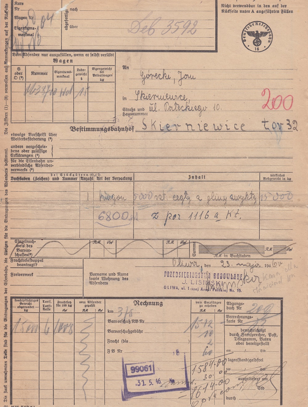 Dokumenty ekspedycyjne wystawiono na blankietach poniemieckich z gapą w maju 1946 roku. Jak wspomina Pani Anna Jerzy Lisiński miał cegielnię w miejscu dzisiejszego Auchan (Spacerowa-Wysoka /Wittstock/).
