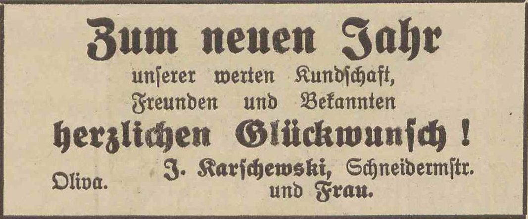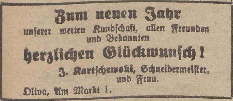 Josef Kartschewski, Schneidermeister. Podziękowania noworoczne, Olivaer Zeitung nr 306 z 31. 12. 1928.