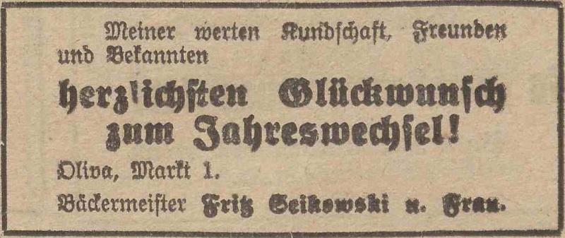 Fritz Seikowski, Bäckermeister. Podziękowania noworoczne, Olivaer Zeitung nr 305 z 31. 12. 1929.