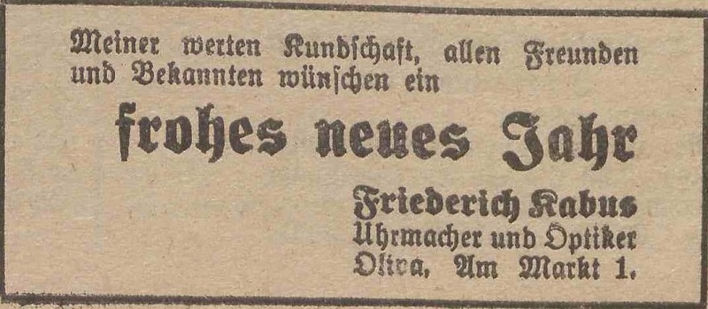 Friedrich Kabus, Uhrmacher und Optiker. Podziękowania noworoczne, Olivaer Zeitung nr 305 z 31. 12. 1931.
