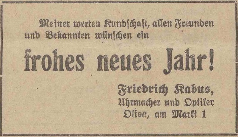 Friedrich Kabus, Uhrmacher und Optiker. Podziękowania noworoczne, Olivaer Zeitung nr 306 z 31. 12. 1928.
