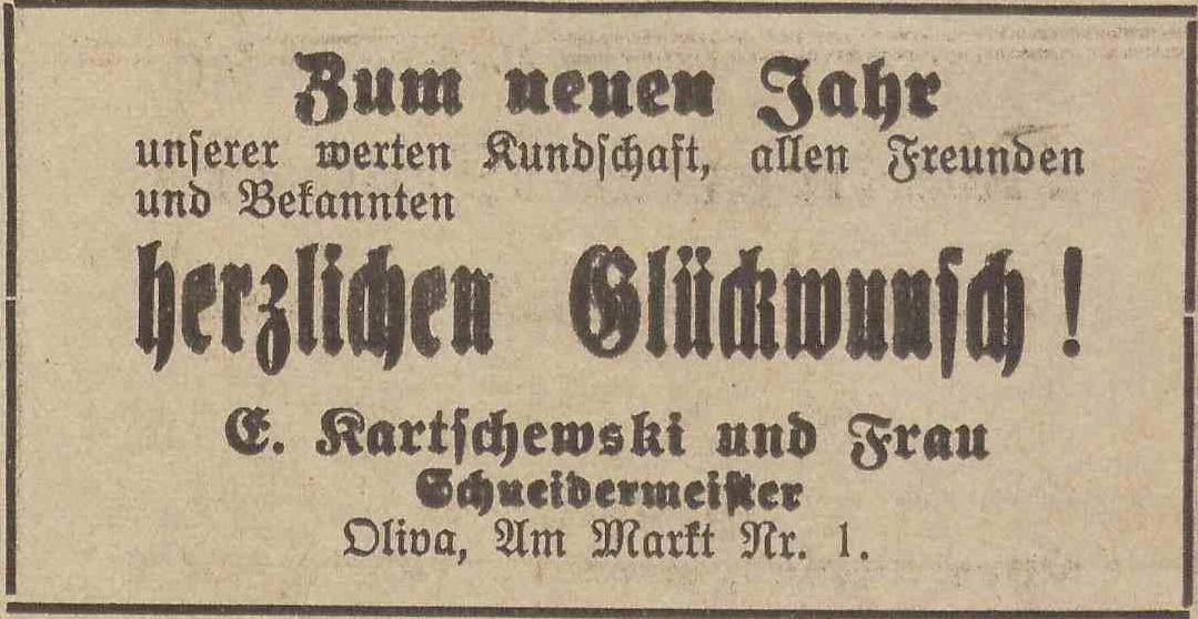 Josef Kartschewski, Schneidermeister. Podziękowania noworoczne, Olivaer Zeitung nr 305 z 31. 12. 1929.