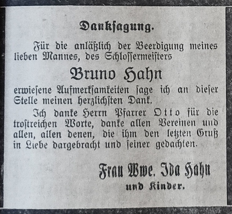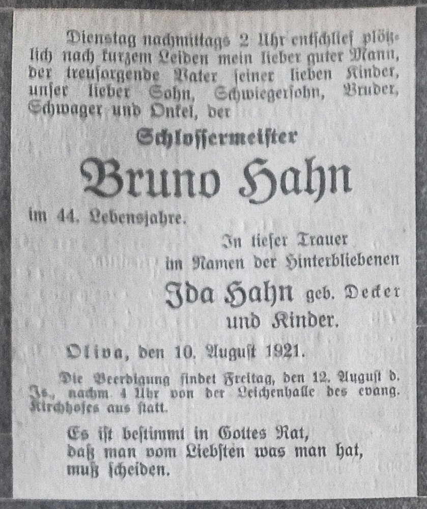 Bruno Hahn. Ida Hahn zd. Decker. Danziger Kreis-Zeitung 1921. Przekazała Grażyna Niemyjska.