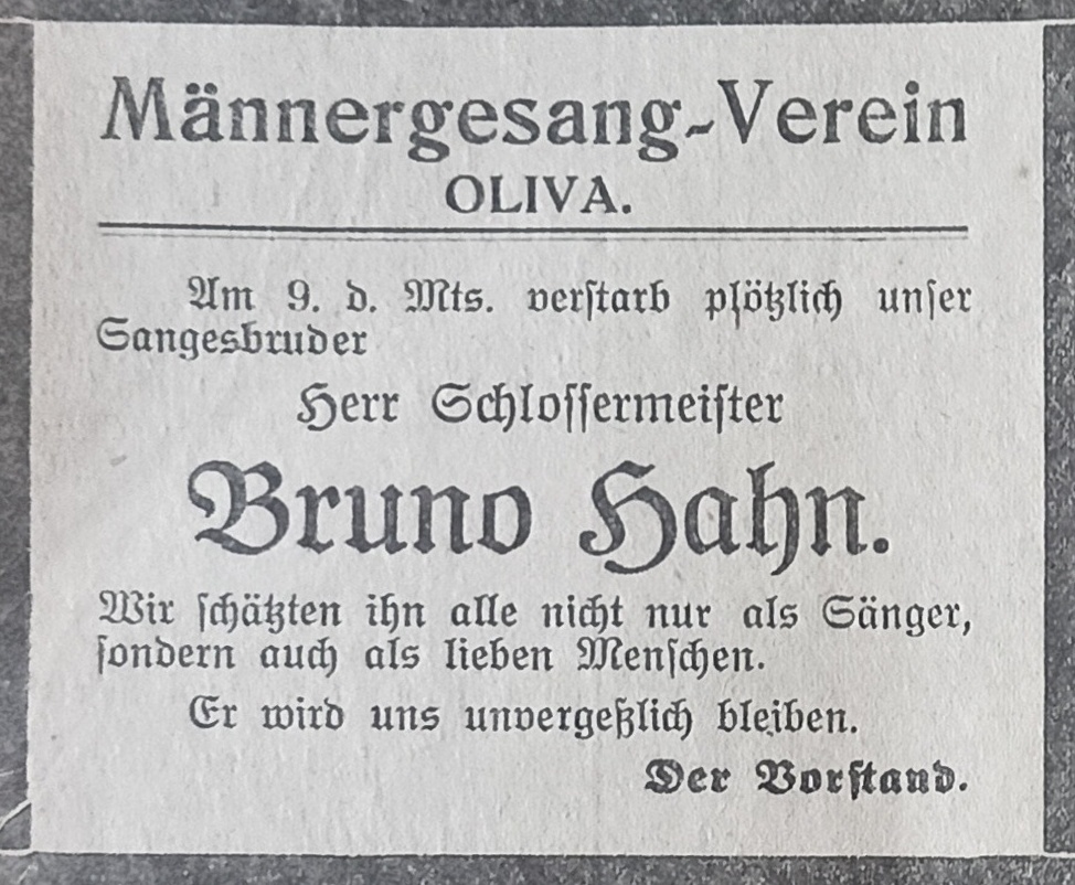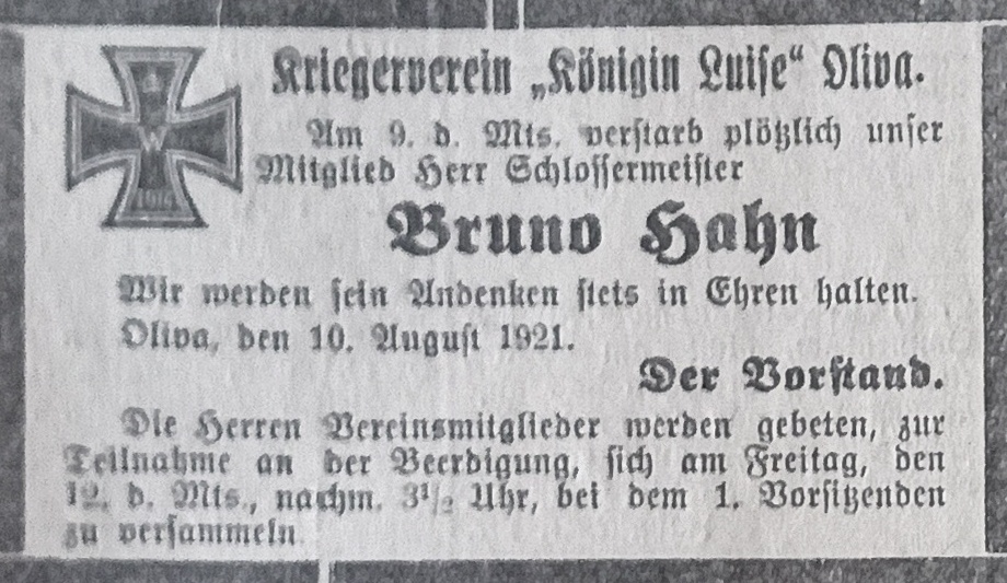 Bruno Hahn. Danziger Kreis-Zeitung 1921. Przekazała Grażyna Niemyjska.