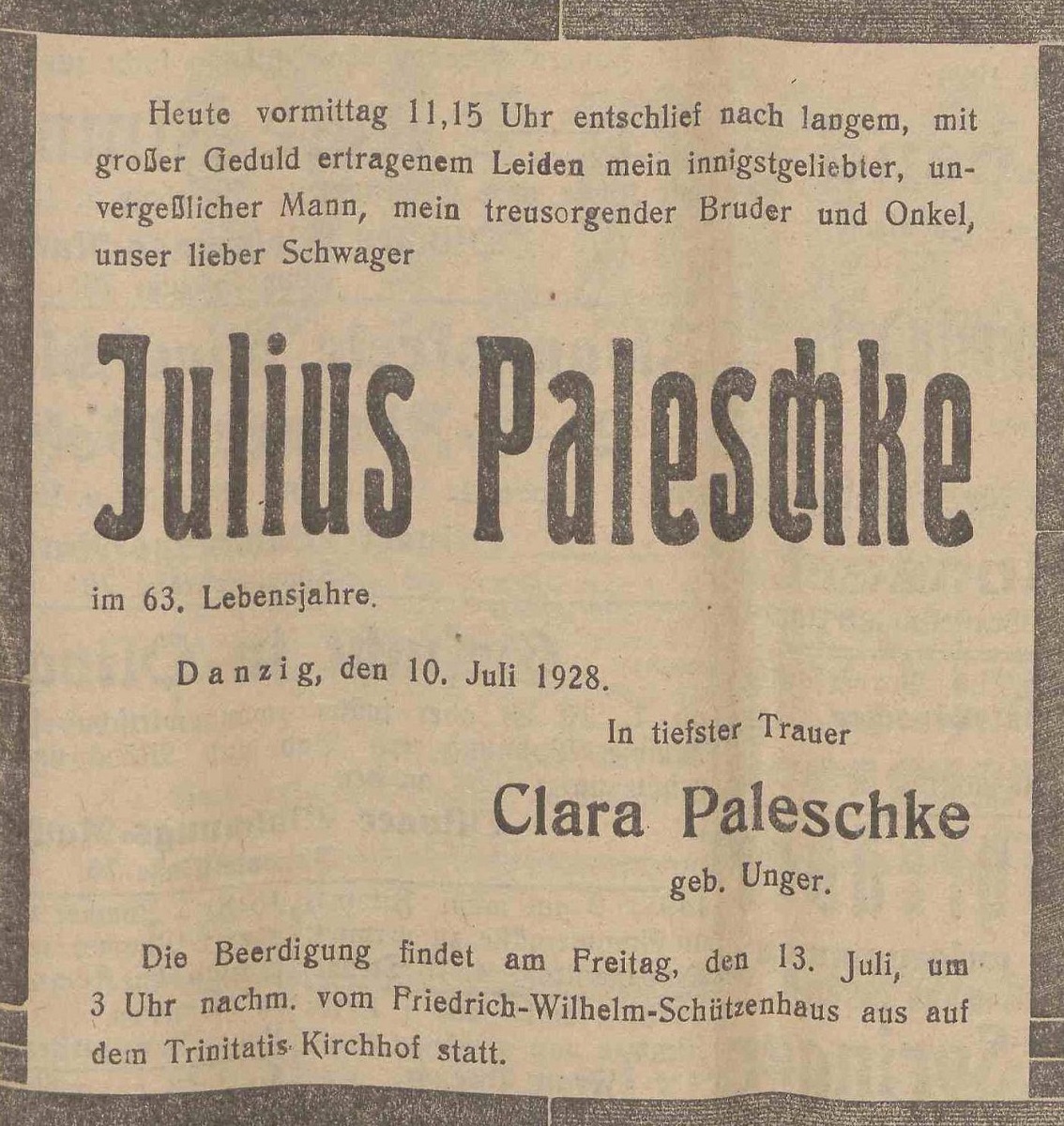 Julius Paleschke. Clara Paleschke zd. Unger. Olivaer Zeintung nr 162 z 12. 06. 1928 r.