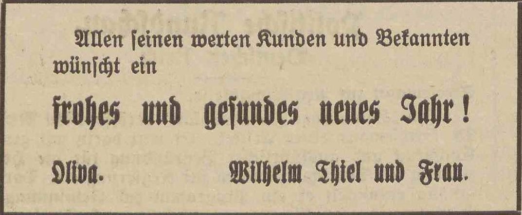 Wilhelm Thiel. Podziękowania noworoczne, Olivaer Zeitung nr 306 z 31. 12. 1920.