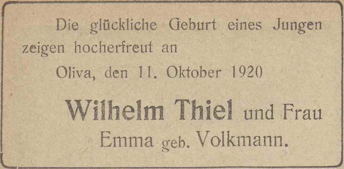 Wilhelm Thiel (1920-1925). Emma Thiel z domu Volkmann. Olivaer Zeintung nr 238 z 11. 10. 1920 r.