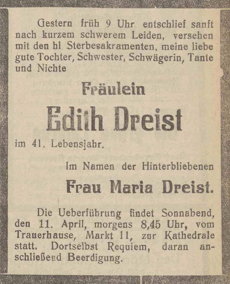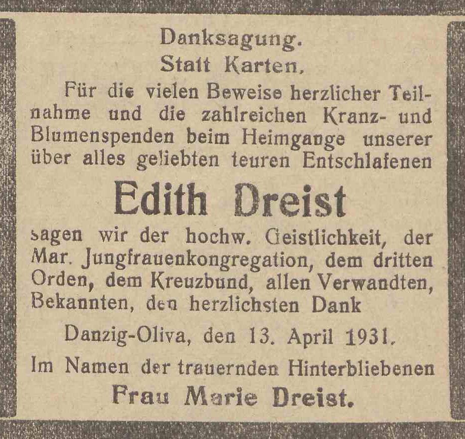 Edith Dreist. Marie Dreist. Danzig-Olivaer Zeintung nr 86 z 14. 04. 1931 r.