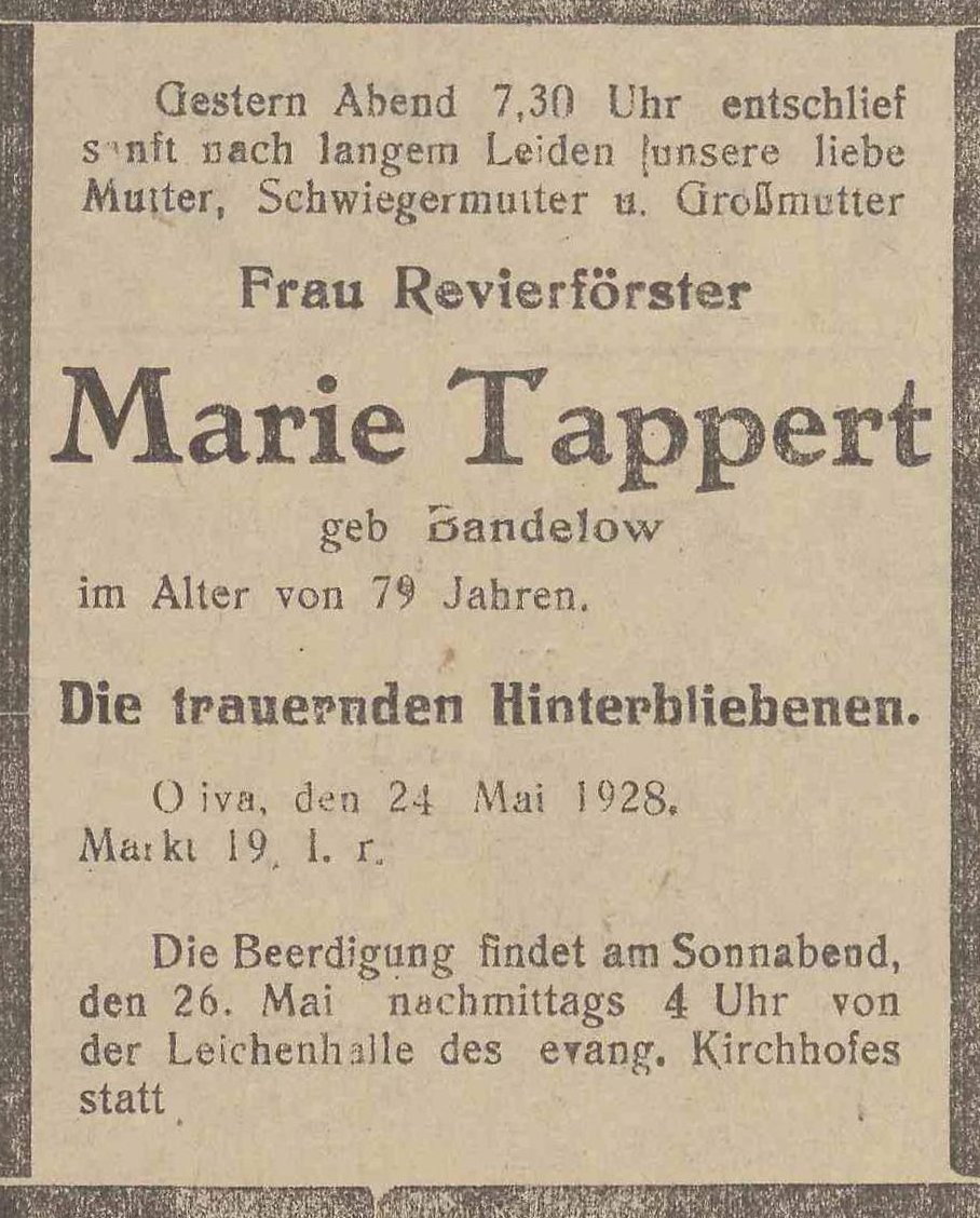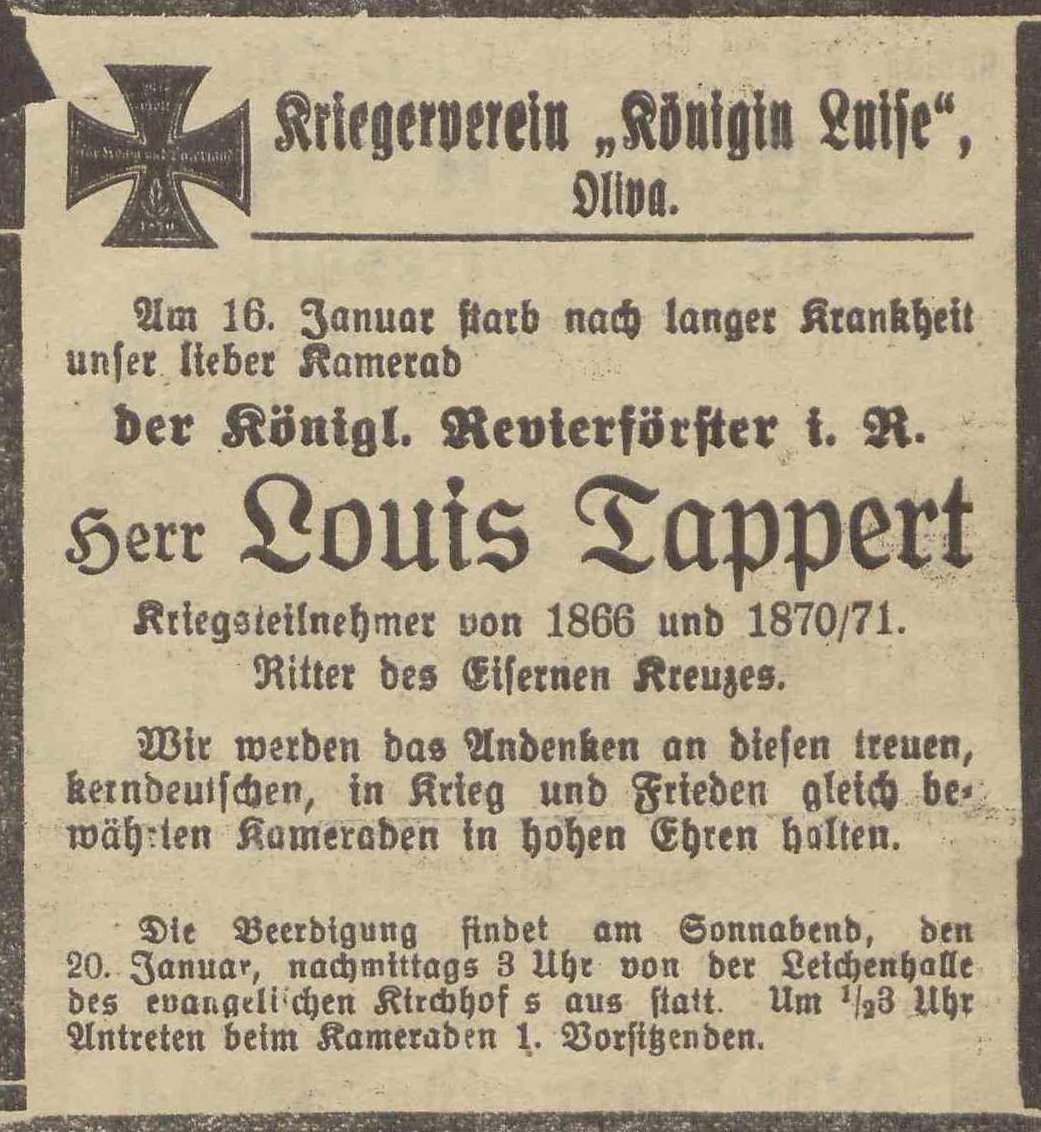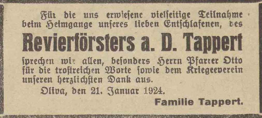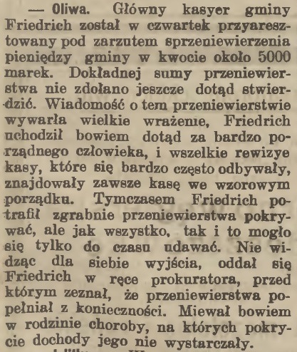 - Oliwa. Główny kasyer gminy Friedrich został w czwartek przyaresztowany pod zarzutem sprzeniewierzenia pieniędzy gminy w kwocie około 5000 marek. Dokładnej sumy przeniewierstwa nie zdołano jeszcze dotąd stwierdzić. Wiadomość o tem przeniewierstwie wywarła wielkie wrażenie, Friedrich uchodził bowiem dotąd za bardzo porządnego człowieka, i wszelkie rewizye kasy, które się bardzo często odbywały, znajdowały zawsze kasę we wzorowym porządku. Tymczasem Friedrich potrafił zgrabnie przeniewierstwa pokrywać, ale jak wszystko, tak i to mogło się tylko do czasu udawać. Nie widząc dla siebie wyjścia, oddał się Friedrich w ręce prokuratora, przed którym zeznał, że przeniewierstwa popełniał z konieczności. Miewał bowiem w rodzinie choroby, na których pokrycie dochody jego nie wystarczały.