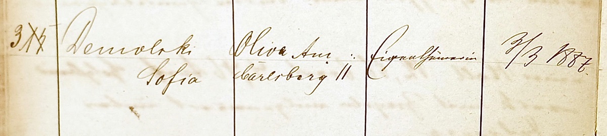 Sofia Demolski. Baukonholle Oliva IXX. Wpis z 03. 03. 1887. Przekazała Grażyna Niemyjska.