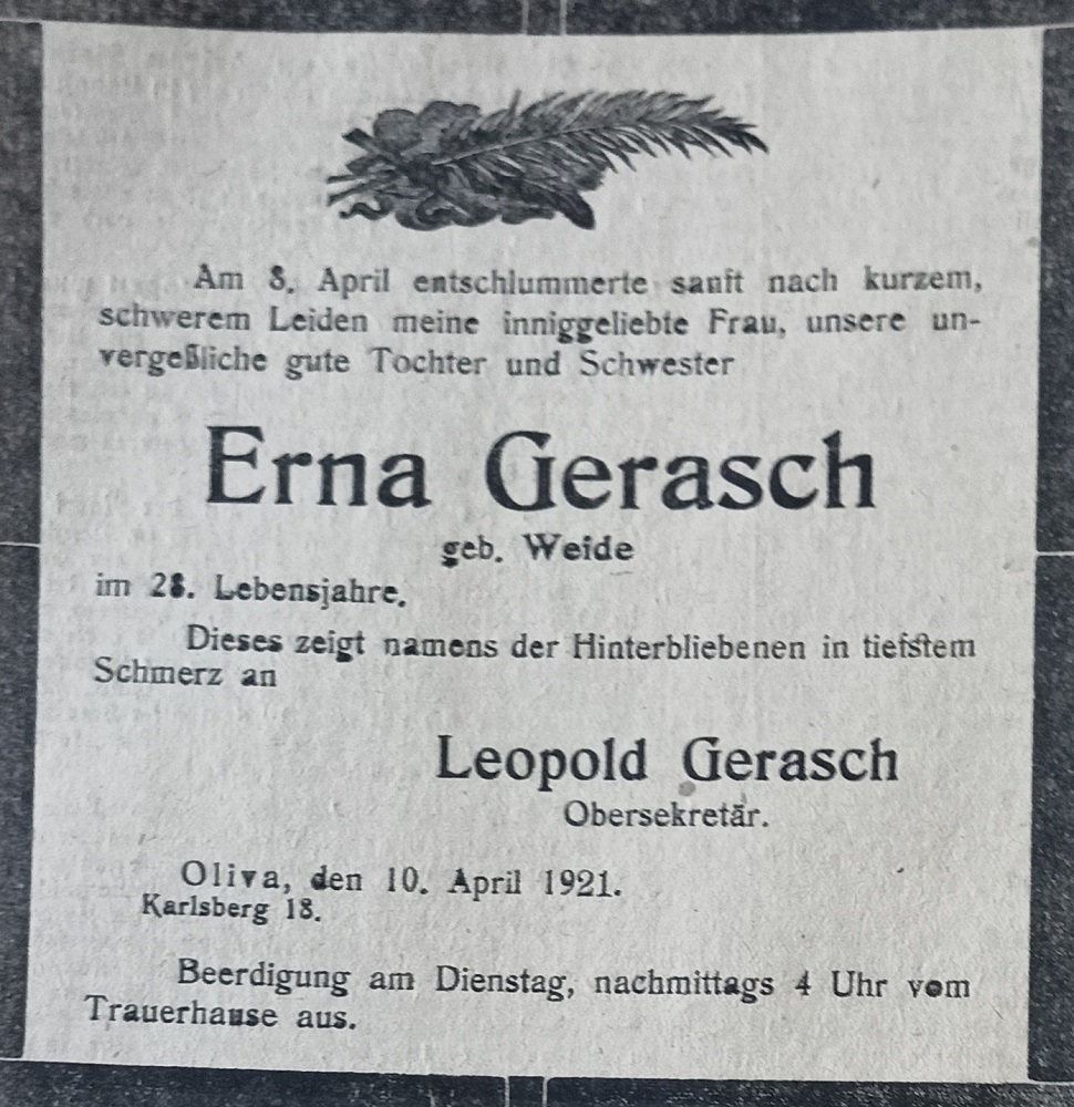 Erna Gerasch zd. Wiede. Leopold Wiede. Danziger Kreis-Zeitung 1921. Przekazała Grażyna Niemyjska.