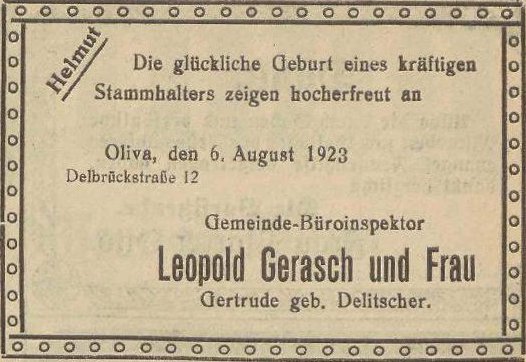 Gertrude Gerasch zd. Delitscher. Leopold Gerasch. Olivaer Zeintung nr 183 z 08. 08. 1923 r.