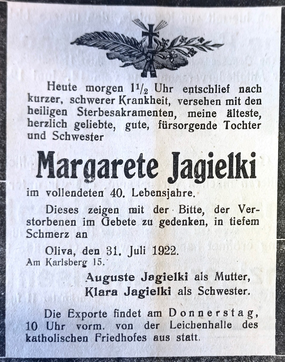 Margarete Jagielki. Auguste Jagielki. Klara Jagielki. 31. 07. 1922. Danziger Kreis-Zeitung 1922. Przekazała Grażyna Niemyjska.