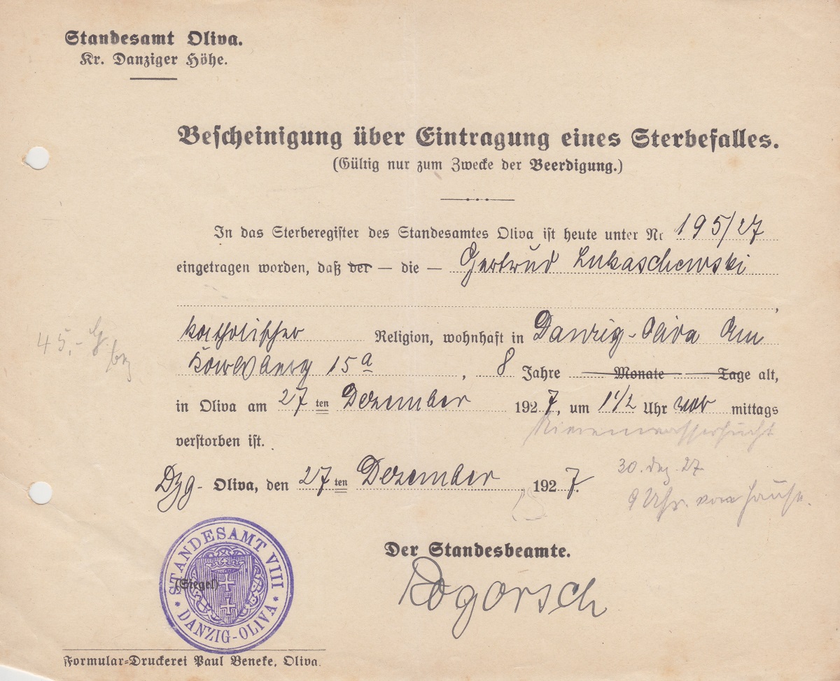 .jpg) Lukaschewski. Bescheinigung über Eintragung eines Sterbefalles wydane 27.12.1927 (zaświadczenie dla celów pochówku). Zbiory Piotra Leżyńskiego.