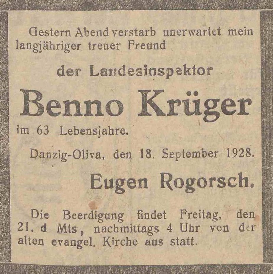Benno Krüger. Eugen Rogorsch. Olivaer Zeintung nr 221 z 19. 09. 1928 r.