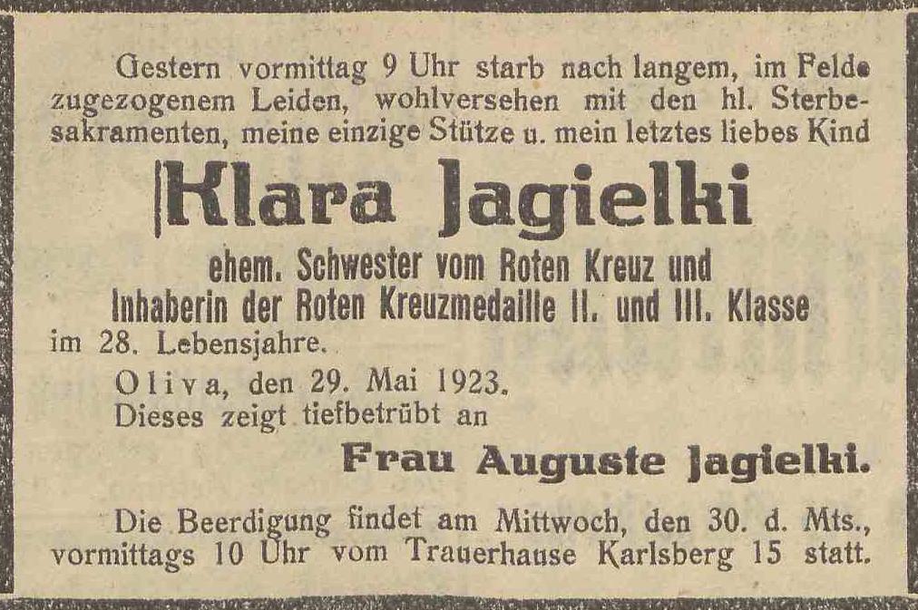 Klara Jagielki. Auguste Jagielki. Olivaer Zeintung nr 122 z 29. 05. 1923 r.