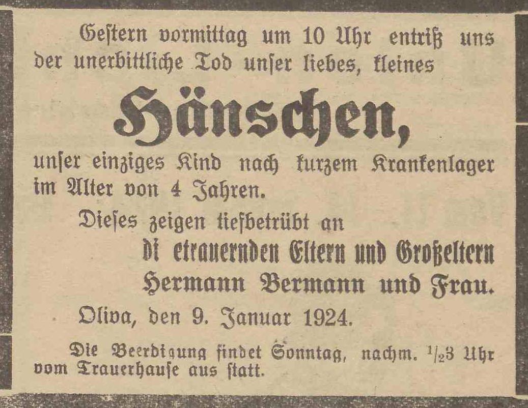 Hänschen Bermann (lat 4). Hermann Bermann und Frau Grete Bermann?. Olivaer Zeintung nr 9 z 11. 01. 1924 r.