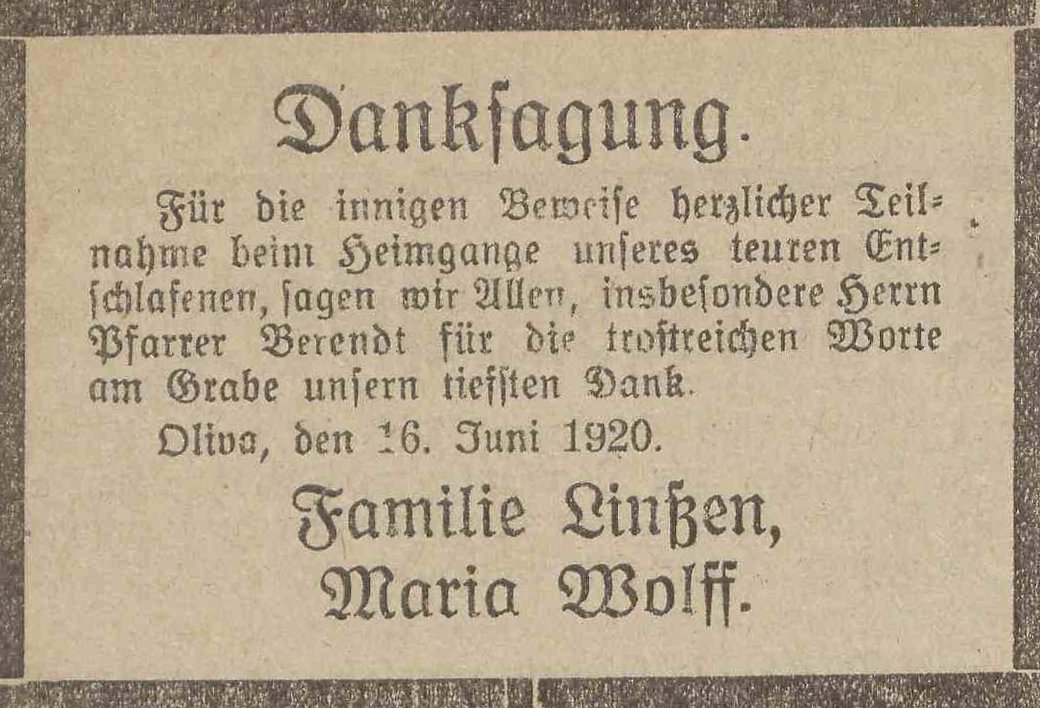 Linßen. Maria Wolff. Olivaer Zeintung nr 138 z 16. 06. 1920 r.