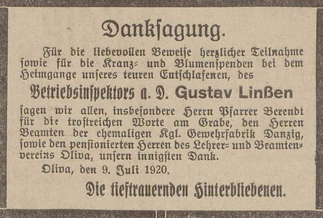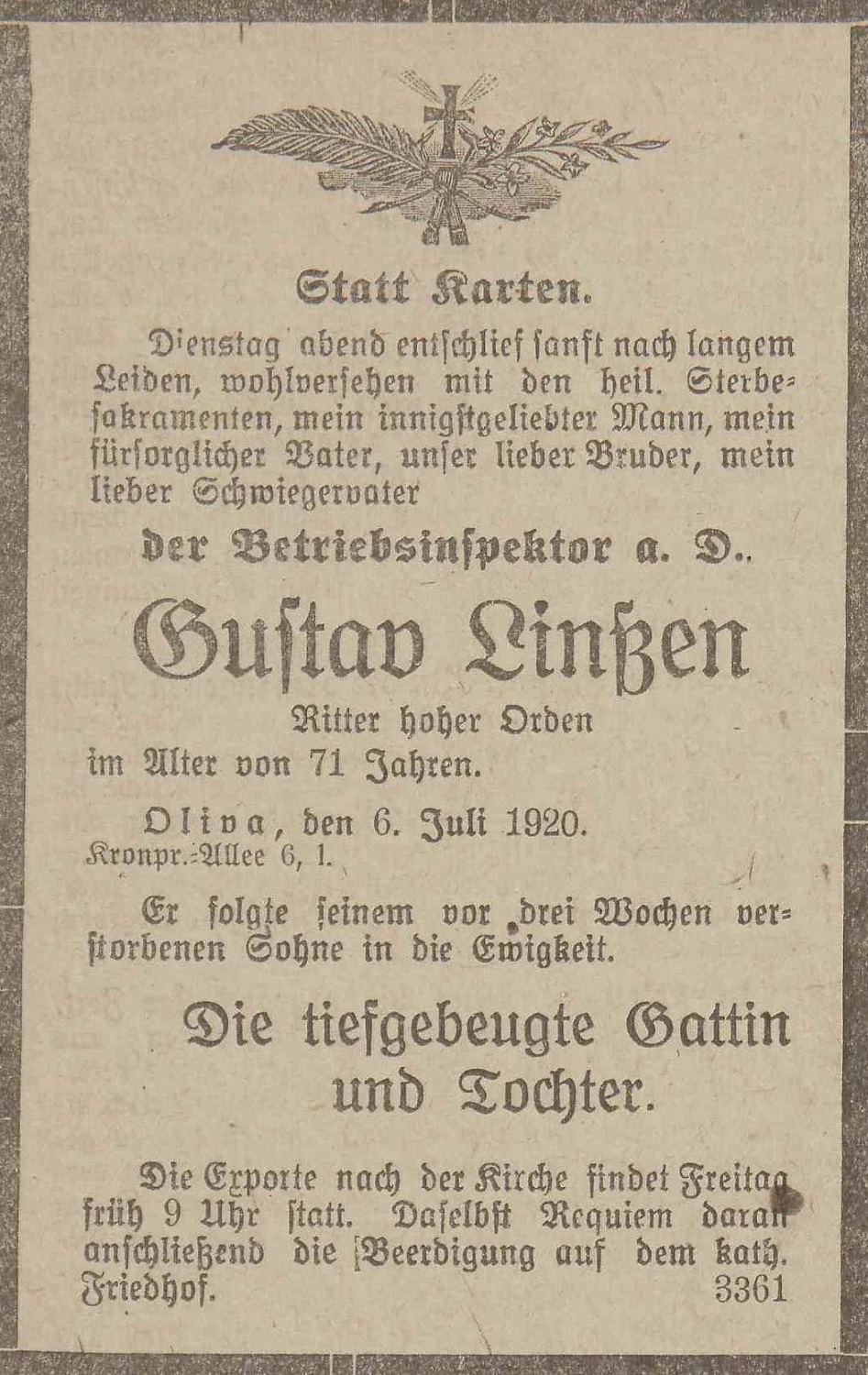 Gustav Linßen. Olivaer Zeintung nr 159 z 10. 07. 1920 r.