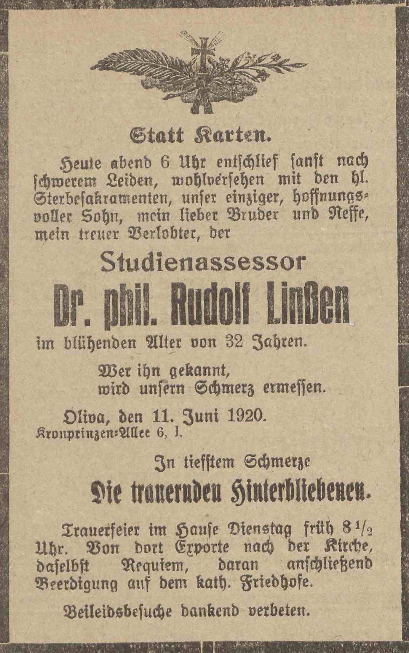 Rudilf Linßen. Olivaer Zeintung nr 136 z 14. 06. 1920 r.